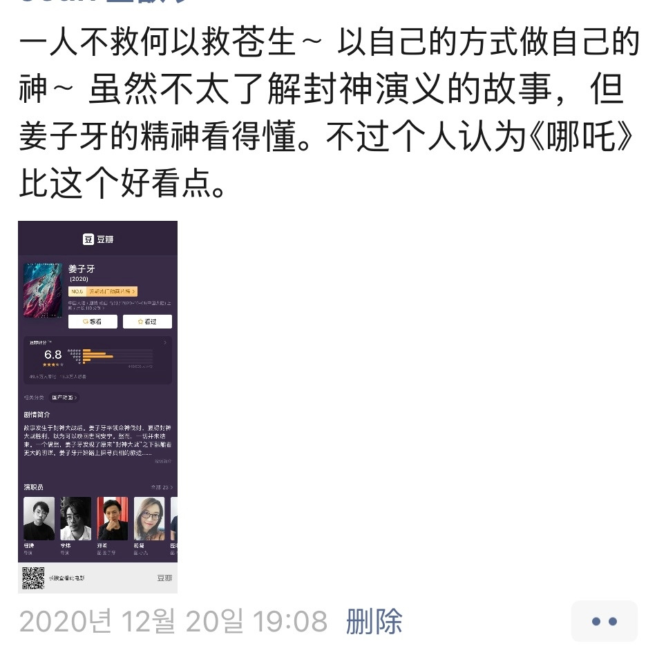 [譯] 한 명도 못 구하는데 어찌 세상 사람들을 구하랴~ 자기만의 방식으로 자기 자신의 신이 되어라~ 봉신연의 이야기는 잘 모르지만, 강자아의 정신이 어떤 것인지는 알 수 있었다. 하지만 개인적으로 <나타지마동강세(哪吒之魔童降世)>가 이 영화보다 더 재밌는 듯.