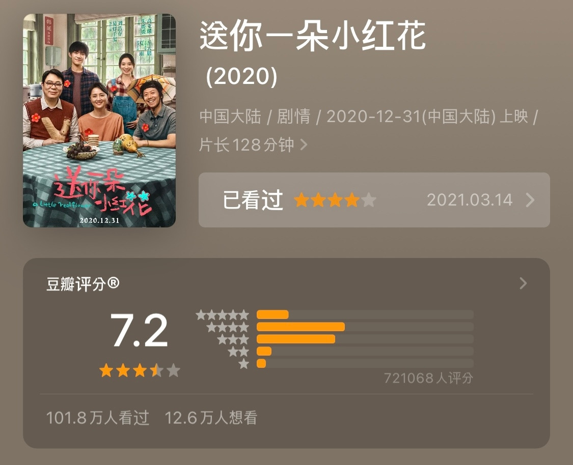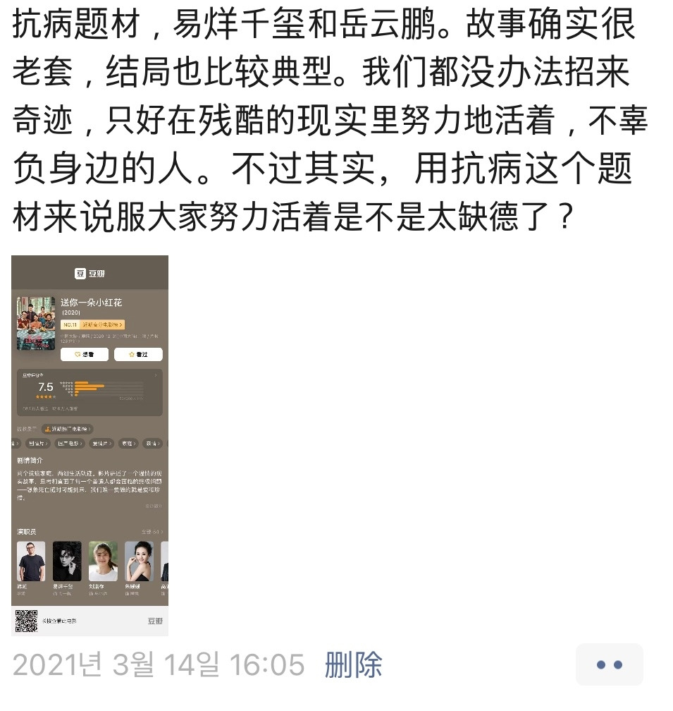 [譯] 투병 소재의 영화. 이양쳰시와 위에윈펑 출연. 스토리도 뻔하고 결말도 전형적이다. 우리는 기적을 불러올 순 없으니 이 잔혹한 현실을 견디며 주변 사람들을 실망시키지 않으면서 살아가기 위해 노력해야 한다. 하지만.. 투병이라는 소재를 가지고 사람들에게 열심히 살아가라고 설득하는 건 좀 잔인한 것 아닌지..?