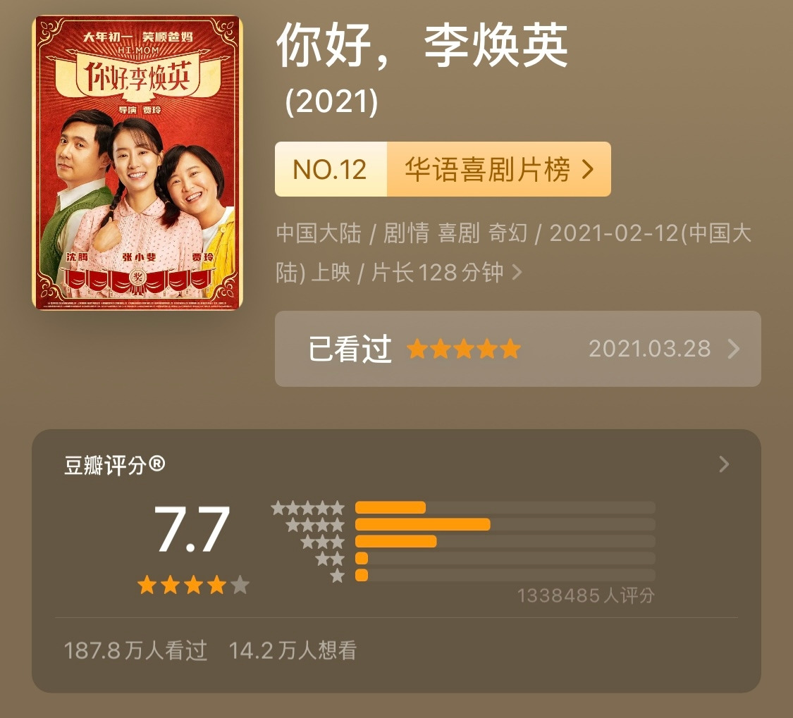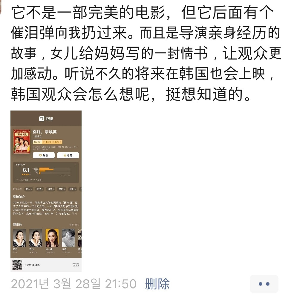 . 예능 <王牌对王牌>에서 보던 방송인 지아링(贾玲)이 메가폰을 잡고 주연으로 출연한 영화. 자신의 실제로 돌아가신 어머니를 소재로 한 영화로, 2021년 춘절 블록버스터로 개봉하였다.