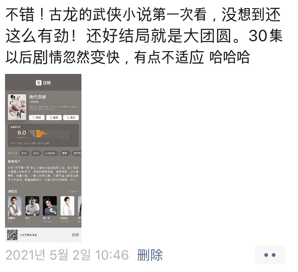 [譯] 재밌다! 구롱의 무협소설은 처음 보는데, 생각보다 재밌었다. 결말이 좋아서 더 좋았다. 30화 이후 스토리가 갑자기 빠르게 전개되어서 적응이 안 됐다. ㅋㅋ