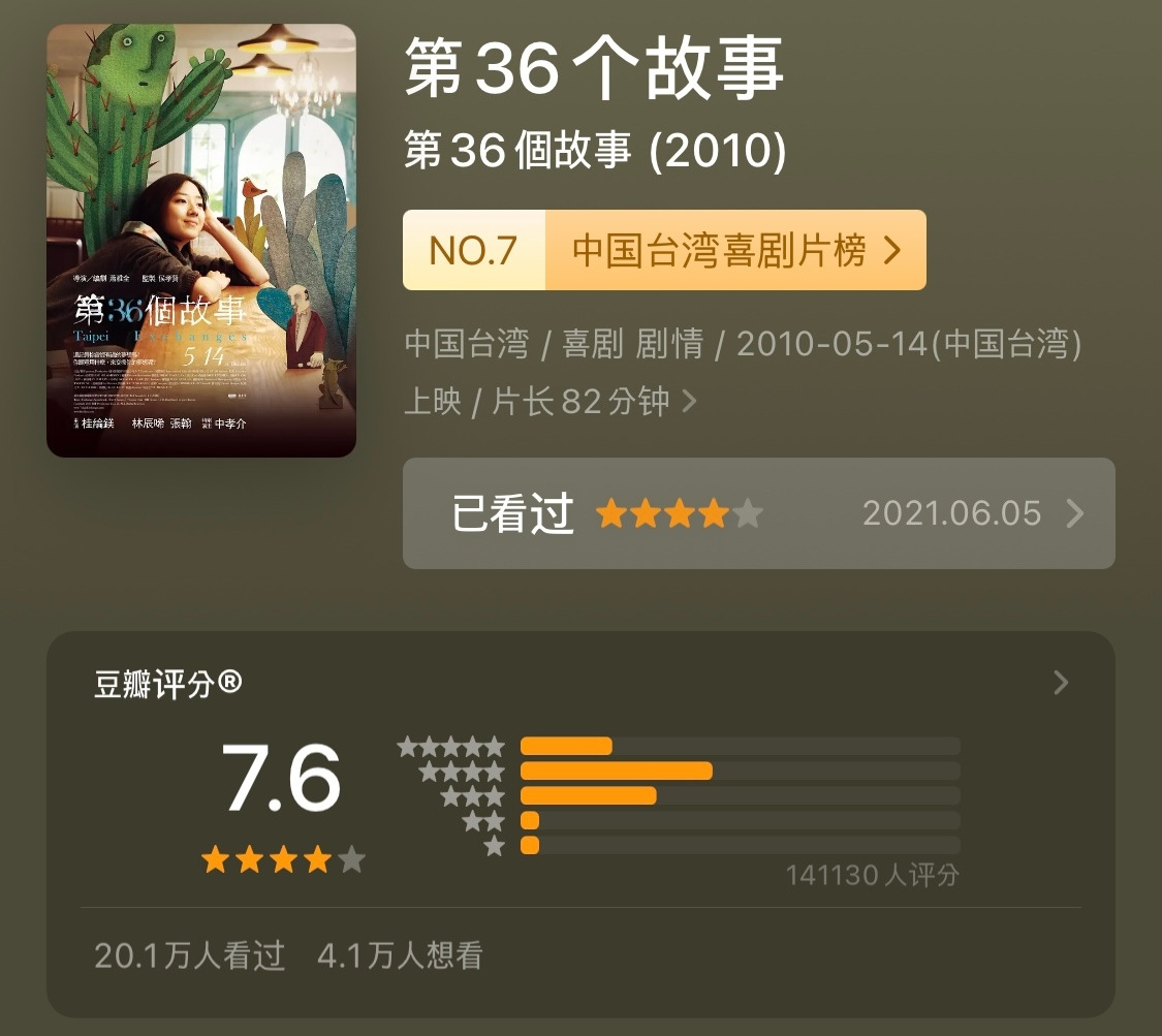 . 넷플릭스에 있던 대만 영화. 원제는 36번째 이야기라는 뜻인데, 번역은 '타이페이 카페 스토리'로 되었다. 개인적으론 원제가 더 의미 있고 좋다고 생각하지만, '타이페이', '카페' 같은 키워드를 직관적으로 보여주는 제목도 시청률을 높이기엔 좋은 전략이었다고 생각한다.