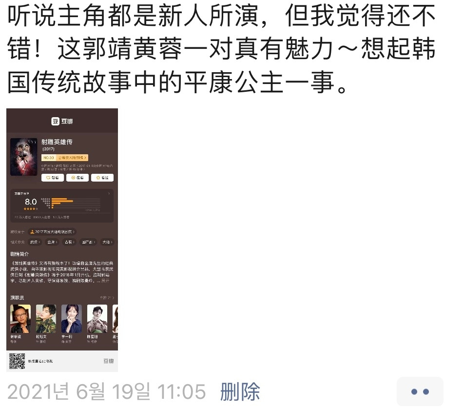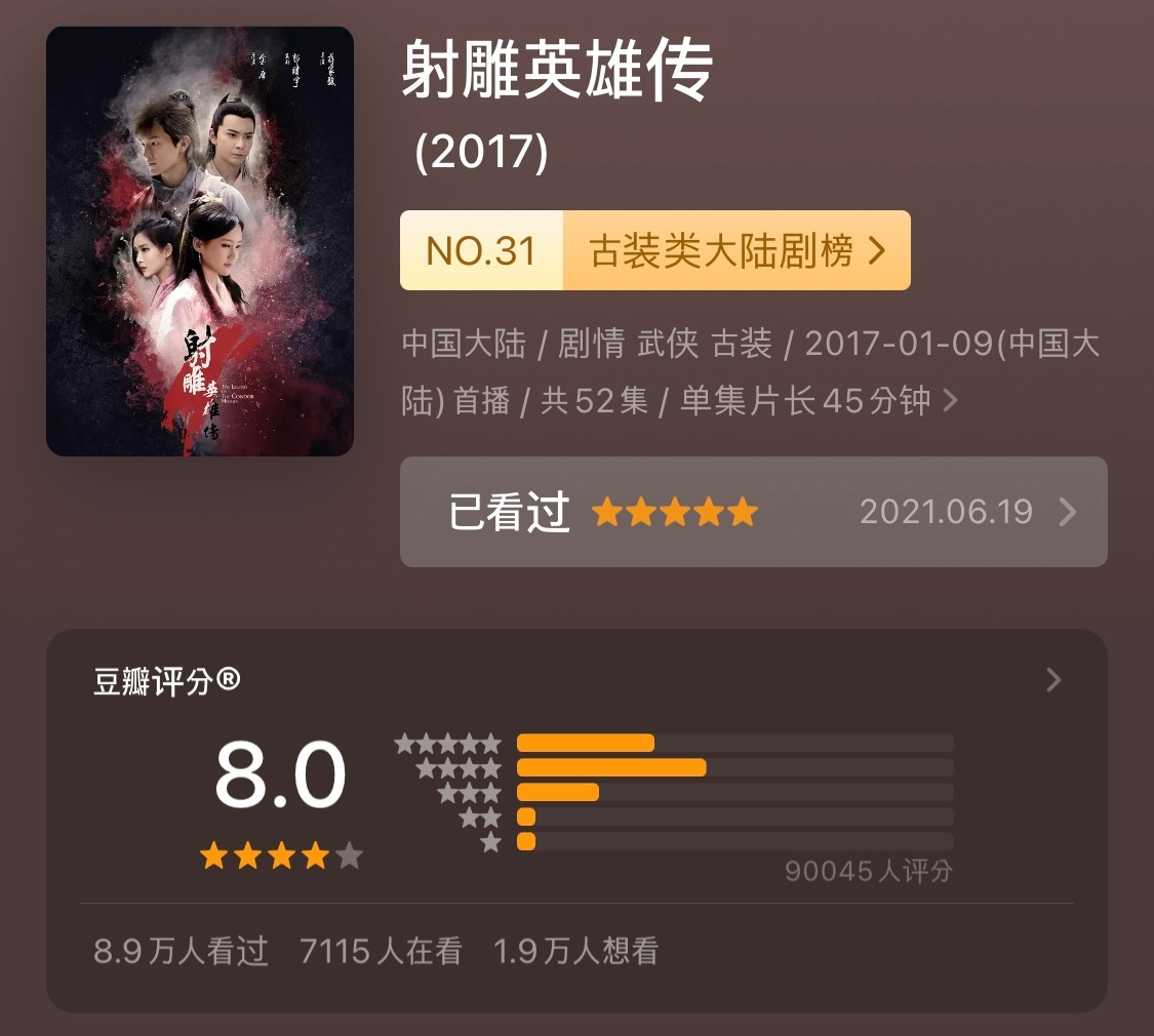 [譯] 주연배우들이 다 신인이라던데, 나쁘지 않았다! 곽정과 황룡 커플 정말 매력 있었다. 한국 전래동화 중 평강공주가 생각나는 스토리..