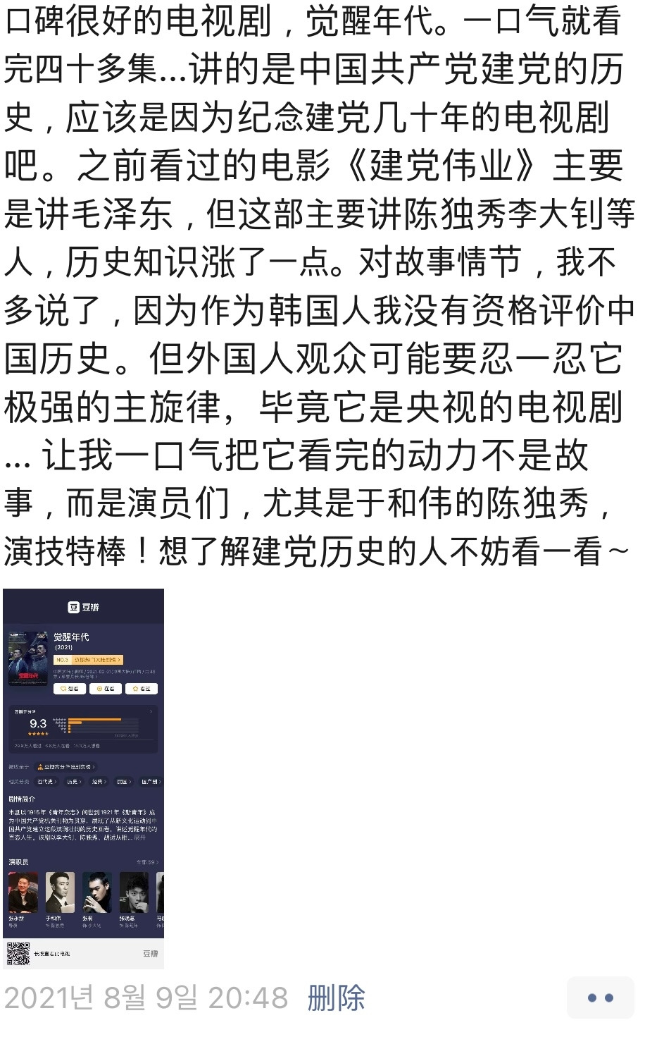 [譯] 평이 정말 좋았던 드라마, 각성년대. 한 번에 사십몇 화를 다 봤다. 중국 공산당이 만들어진 역사를 다루는데, 아마도 건당 몇십 년을 기념한 드라마일 것이다. 전에 봤던 <건당위업>은 마오쩌둥에 대한 이야기가 메인이었는데, 이 드라마는 천두슈(陈独秀)와 리따자오(李大钊) 등에 대한 이야기라 역사를 배울 수 있었다. 스토리에 대해서는... 나는 한국인이기에 중국 역사를 평가할 자격이 없으니 이 부분에 대해서는 말을 아끼겠다. 하지만 외국인 시청자라면 이 매우 매우 강한 주선율을 참아야 할 것이다. 왜냐면 이 드라마는 CCTV에서 만든 드라마거든... 내가 한 번에 이 드라마를 다 볼 수 있었던 동력은 스토리가 아니라 배우들이었다. 특히 위허웨이의 천두슈. 연기 정말 최고! 공산당 건당 역사를 알고 싶은 사람이라면 한 번 볼만하다.