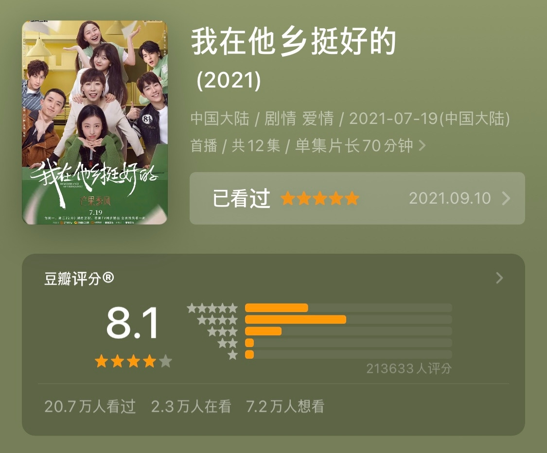 . 이 드라마는 사회 초년생들에게 추천한다. 개인적으론 <환락송(欢乐颂)>이나 <삼십이이(三十而已, 겨우, 서른)>보다 내용이나 설정이 훨씬 현실적으로 다가왔다. 길이도 괜찮고, 보고 나면 마음속이 따뜻해짐을 느낄 수 있을 것이다. <산해정(山海情)>의 바이위판(白宇帆), 최근 뜨는 배우 마쓰차오(马思超)의 등장도 보는 재미가 있다.