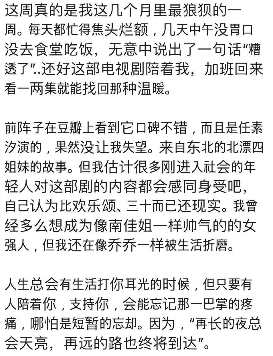 이 드라마는 최근에 또우빤에서 평점도 좋고, 런쑤시(任素汐)가 주연을 했길래 기대했는데 역시 실망시키지 않았다. 동북지방에서 북경에 상경해 생활하고 있는 4명의 여자들의 이야기인데, 아마도 이제 막 사회에 발을 내디딘 젊은이들이라면 이 드라마의 내용에 모두 공감할 것 같다. 내가 보기엔 <환락송>이나 <삼십이이>보다 훨씬 현실적인 드라마다. 나도 난쟈(南佳)처럼 멋진 여장부가 되고 싶었는데, 지금의 나는 챠오챠오(乔乔)처럼 삶에 고통받고 있는 중이다.
