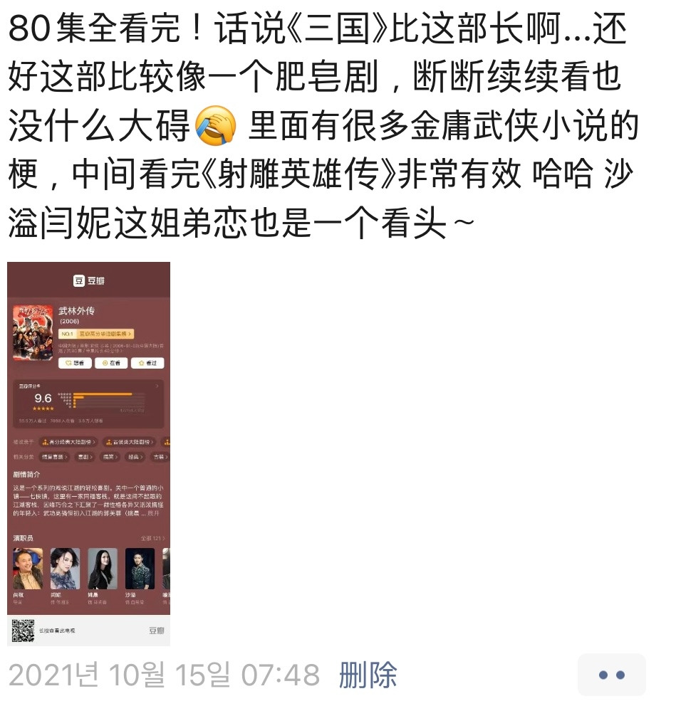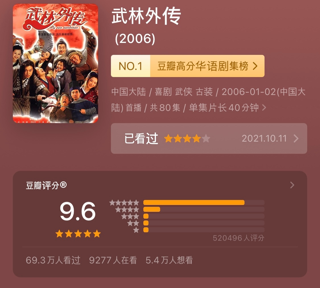 . '한국에 <순풍산부인과>가 있다면, 중국에는 <무림외전>이 있다! (더 적절한 시트콤 제목을 아시면 말씀 부탁드립니다..ㅋ)'고 할 수 있을 만큼 정말 국민 시트콤인 작품. 다만 길이가 80화로 매우 길고 미남미녀 배우는 별로 없어서 진입장벽이 높은 편이다. 평점 높은 드라마 도장 깨기 중에 사실 시작할까 말까 무척 망설였는데, 기왕지사 하기로 한 도장 깨기 제대로 해보자는 마음으로 시작했다. 길이가 너무 길고 다른 드라마가 보고 싶어서 중간중간 그만두고 싶은 위기가 꽤 찾아왔는데, 시트콤이다 보니 다른 드라마랑 동시에 보면서 어찌저찌 위기를 넘겨 결국 완주했다. 완주 후 꽤 성취감이 높았던 작품.
