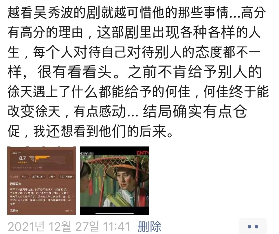 [譯] 우슈보 드라마를 볼 때마다 그의 그 스캔들이 너무 아쉽다. 평점이 높은 데는 다 이유가 있는 듯. 이 드라마에는 정말 다양한 인간군상이 나오는데, 모든 인물이 자기 자신을 대하는 것과 다른 사람들 대하는 태도가 모두 달라서 재밌었다. 이전에 누구에게도 뭘 주고 싶어하지 않았던 쉬톈(徐天)이 무엇이든 주고자 하는 허쟈(何佳)를 만나고, 허쟈가 결국 쉬톈을 변화시키는 모습이 감동적이었다. 결말이 좀 갑작스럽긴 한데, 그들의 미래 모습이 보고 싶다.