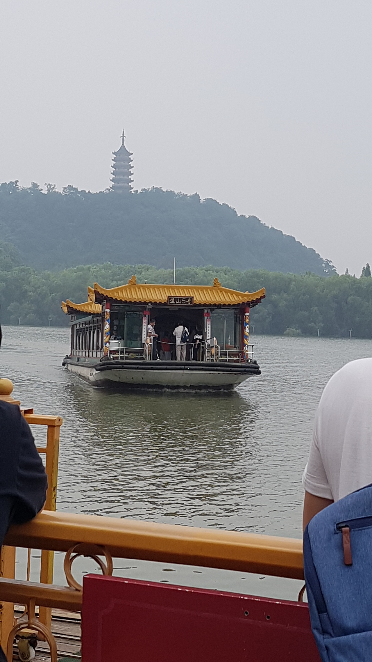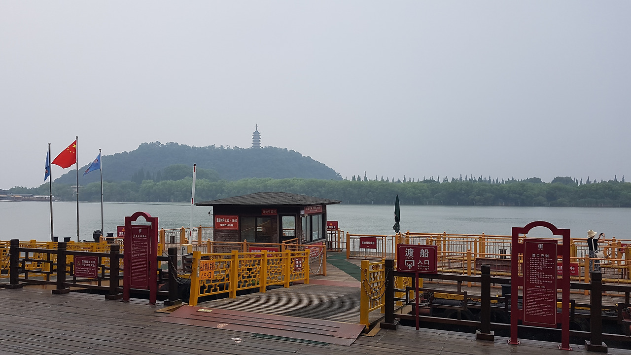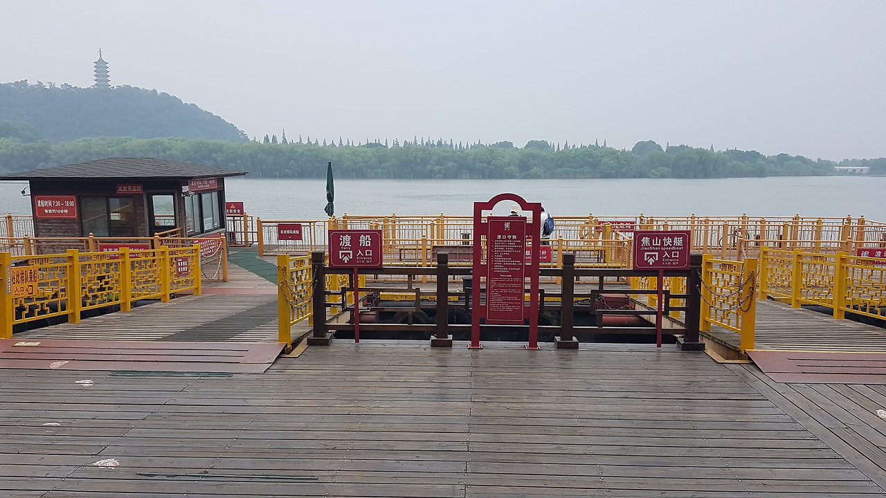 날이 워낙 안 좋아서 그런지 나루터에 사람이 없다. 하지만 지역연구를 똑같은 장소로 두 번 올 수는 없는 운명이기에 여기까지 온 이상 돌아갈 수 없다! 일단 배를 타고 쟈오샨으로 향해 본다. 저 멀리 입장권에서 봤던 모습 그대로의 쟈오샨의 모습이 보인다. 산 위에 보이는 높은 탑은 꼭대기에 있는 만불탑(万佛塔)이다. 비가 와서 아마 가까이서 볼 일은 없을 듯하고, 탑은 그냥 이렇게 멀리서 사진으로만 남겨야겠다.