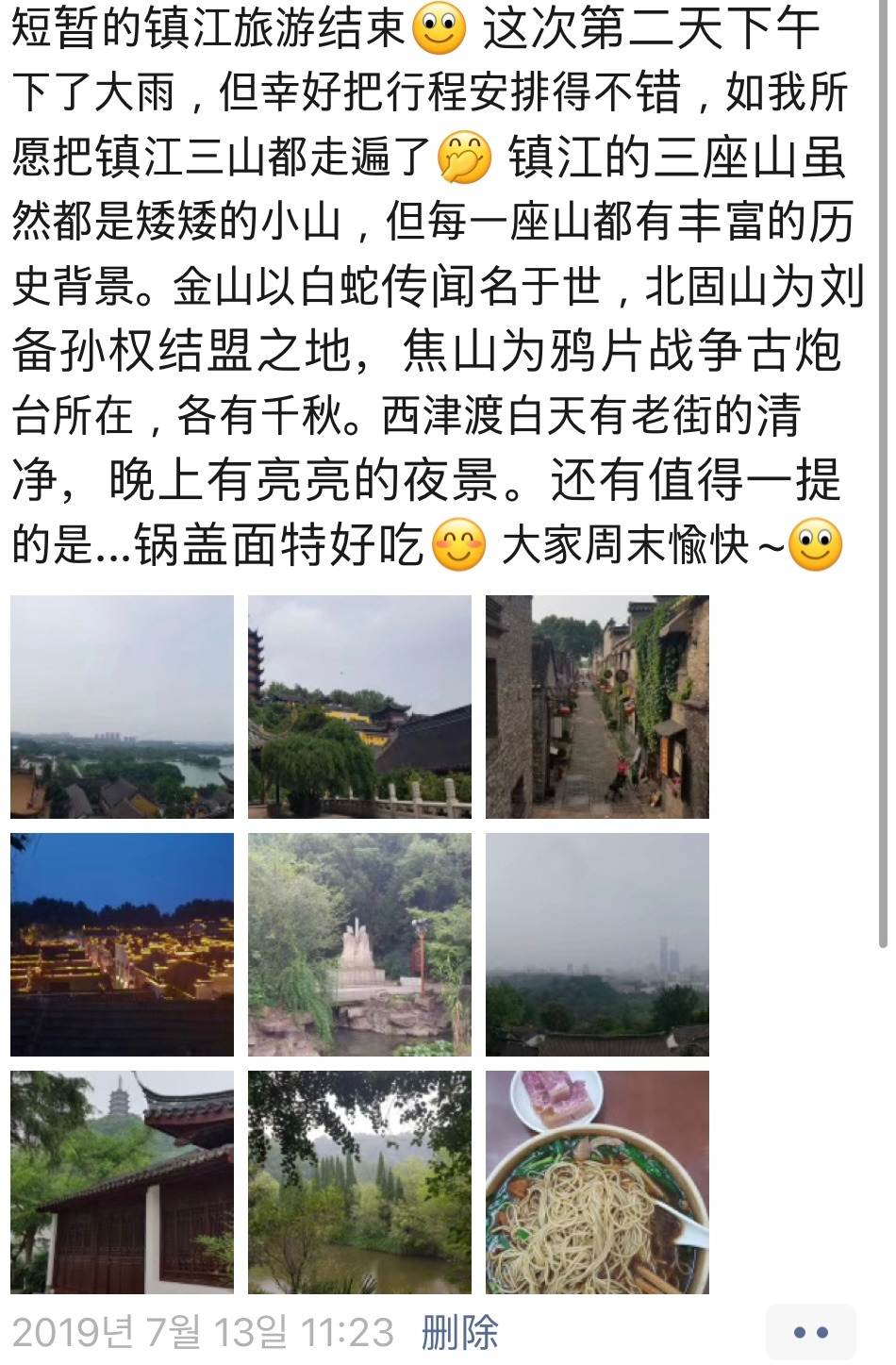 (譯) 짧았던 쩐쟝 여행이 끝났다. 이번엔 이틀째 오후에 폭우가 내렸는데, 다행히 일정을 잘 짜놔서 쩐쟝의 삼산을 소원대로 다 볼 수는 있었다. 쩐쟝의 세 산은 비록 모두 높이가 낮은 산이지만, 모든 산이 풍부한 역사적 배경을 가지고 있었다. 진샨은 백사전으로 세상에 알려져 있고, 베이꾸샨은 유비와 손권이 동맹을 맞은 곳으로, 쟈오샨은 아편전쟁의 포대 소재지로, 각자의 매력이 있었다. 씨진두의 낮은 옛 길의 한적함이, 밤은 반짝이는 야경이 있었다. 또 이야기할만한 것은, 꿔까이몐이 맛있었다. 다들 주말 잘 보내길!