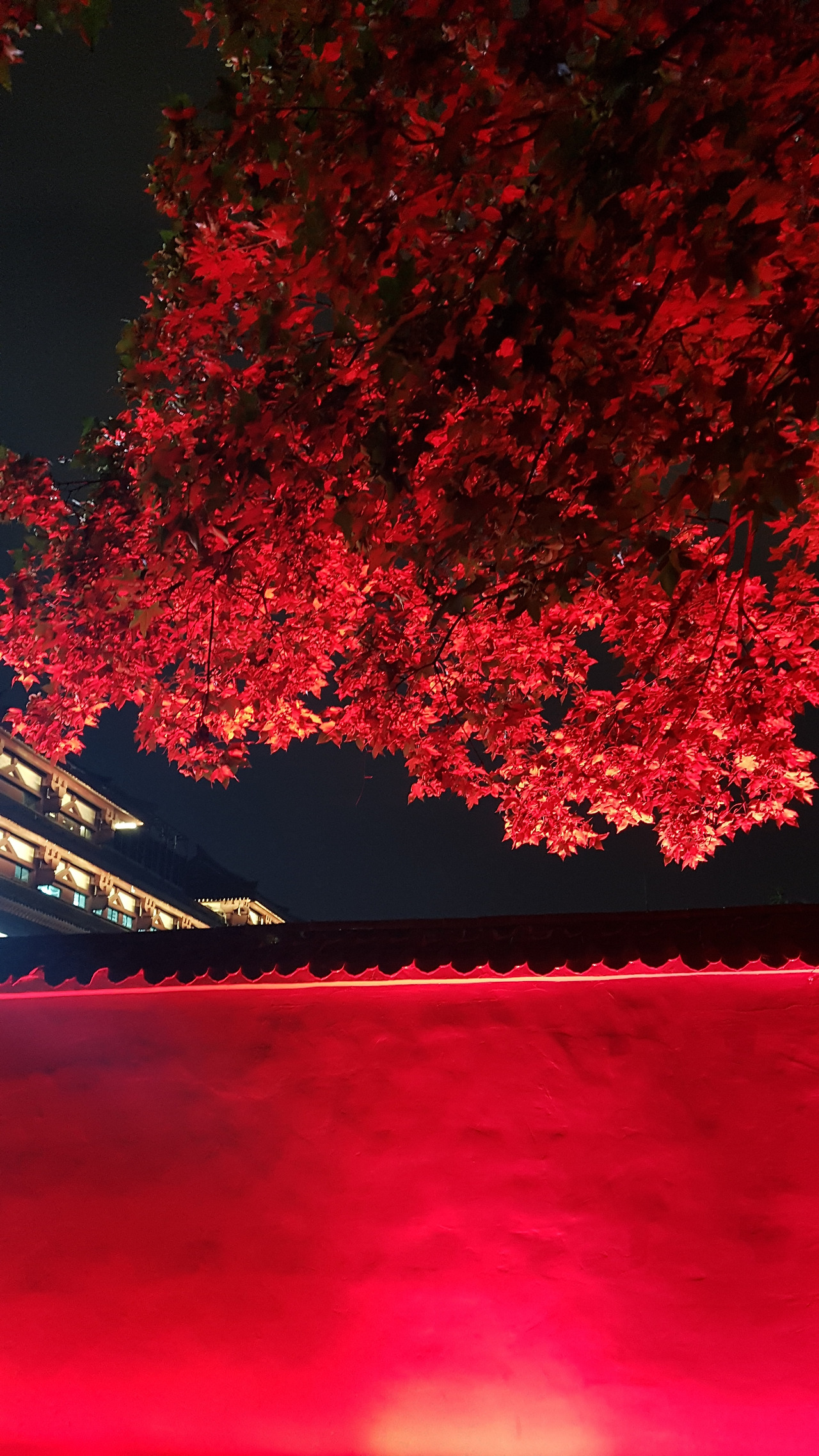 LED 폭탄을 맞고 숙소로 돌아가는 길, 은은한 조명 아래 비친 자은사의 벽과 빨간 단풍잎에 시선이 간다. 검푸른 밤하늘에 붉은 단풍, 붉은 담벼락과 은은한 불빛이 참 잘 어울린다. 시안에 이런 아름다움도 있었구나. 좋아하는 음악분수를 보고 와서 그런가, 좋은 것만 눈에 들어온다. 뭐든지 용서할 수 있을 것 같은, 시안의 여름밤이다.