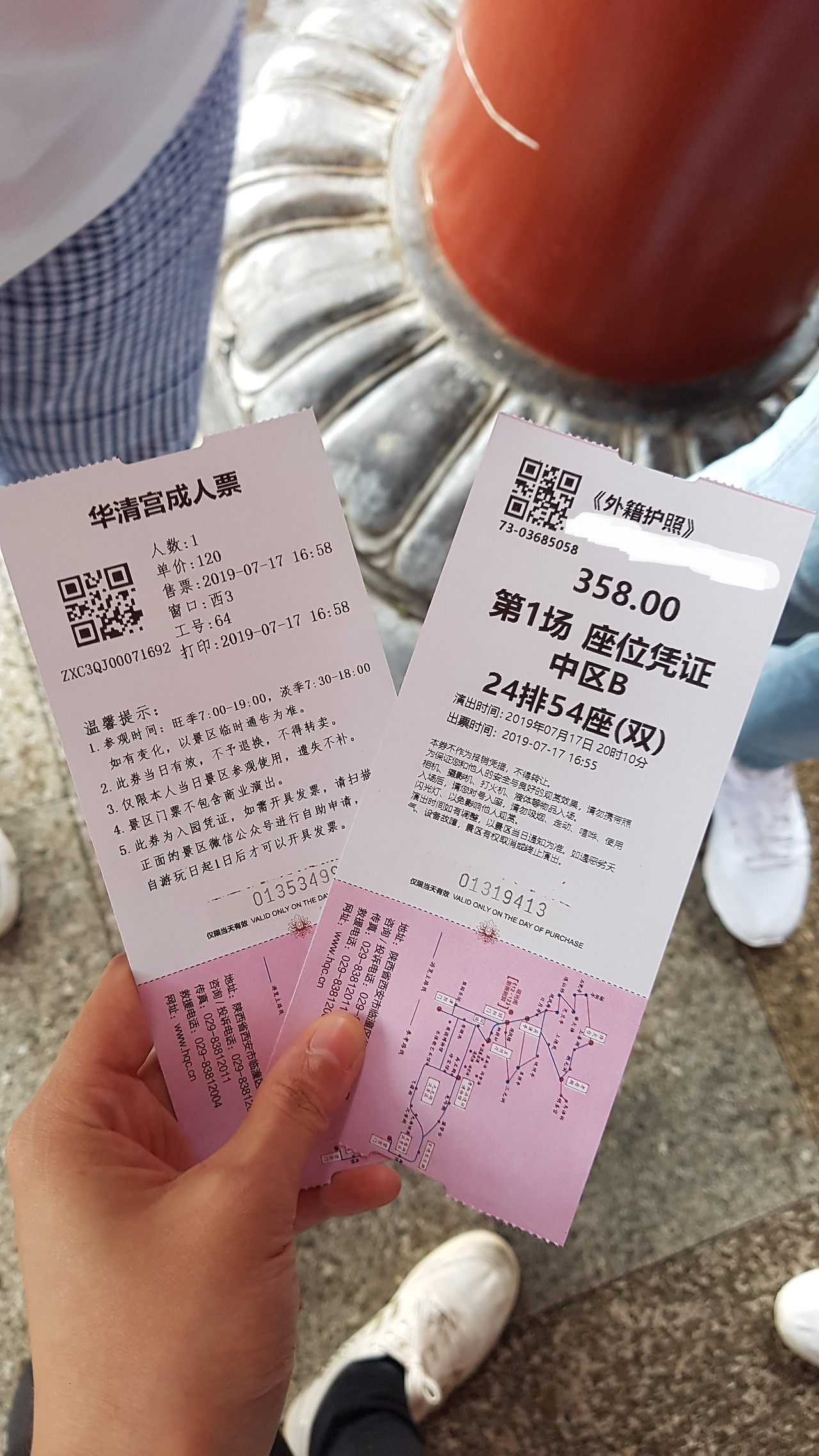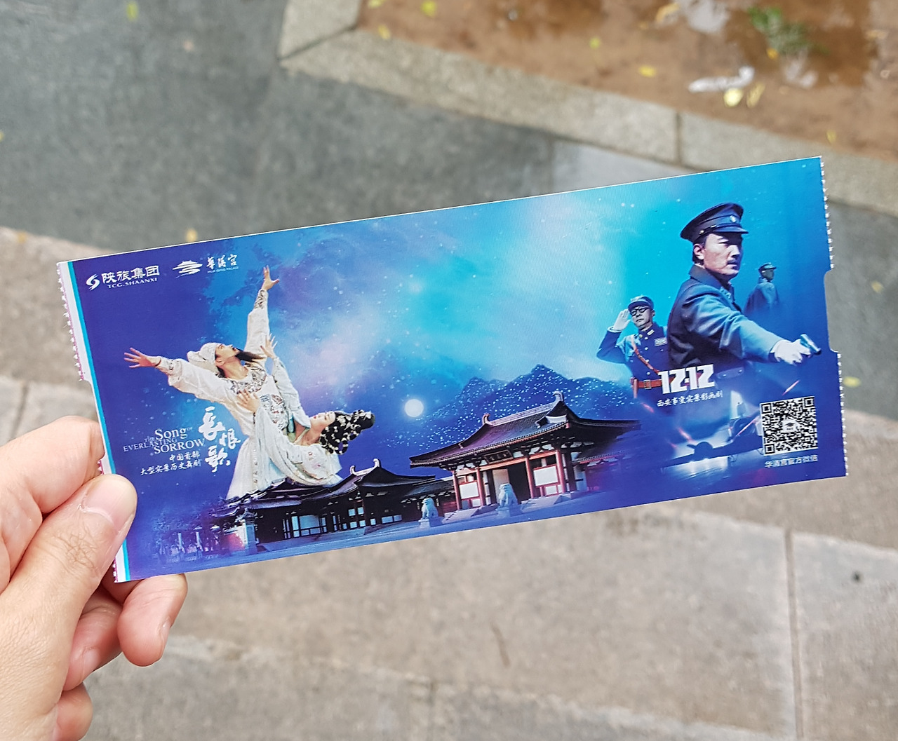 날이 좋지 않고 으스스해서 대충 구경하고 화청궁 밖으로 나왔다. 공연 관람을 위해 문이 다시 열릴 때까지 한 한 시간 넘게 남은 상황. 비는 계속 내리고, 생각보다 날씨가 너무 안 좋았다. 공연을 하긴 할까, 취소되는 건 아닐까, 같이 간 사람들과 불안에 떨었다. 비가 오더라도 공연이 강행된다면 우산은 못쓸 것 같아 정문 앞 매점에서 우비를 샀다. 간단히 소시지 등으로 요기를 하고 공연을 기다렸다. 다행히 부슬비 수준이라 공연은 예정대로 진행되는 듯했다. 338위안, 우리 돈으로 6만 원이 넘는 공연이다. 어떤 식으로 진행될지 궁금했다.