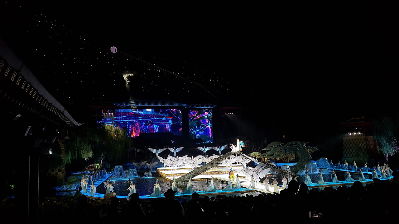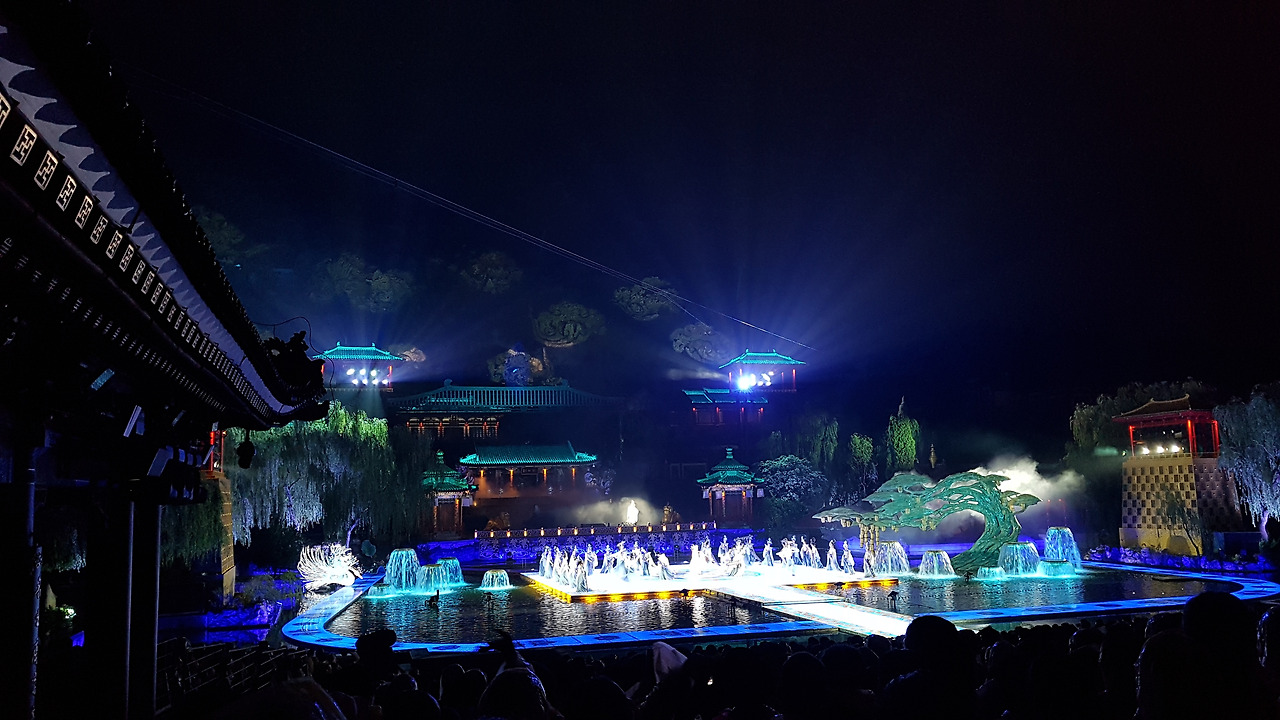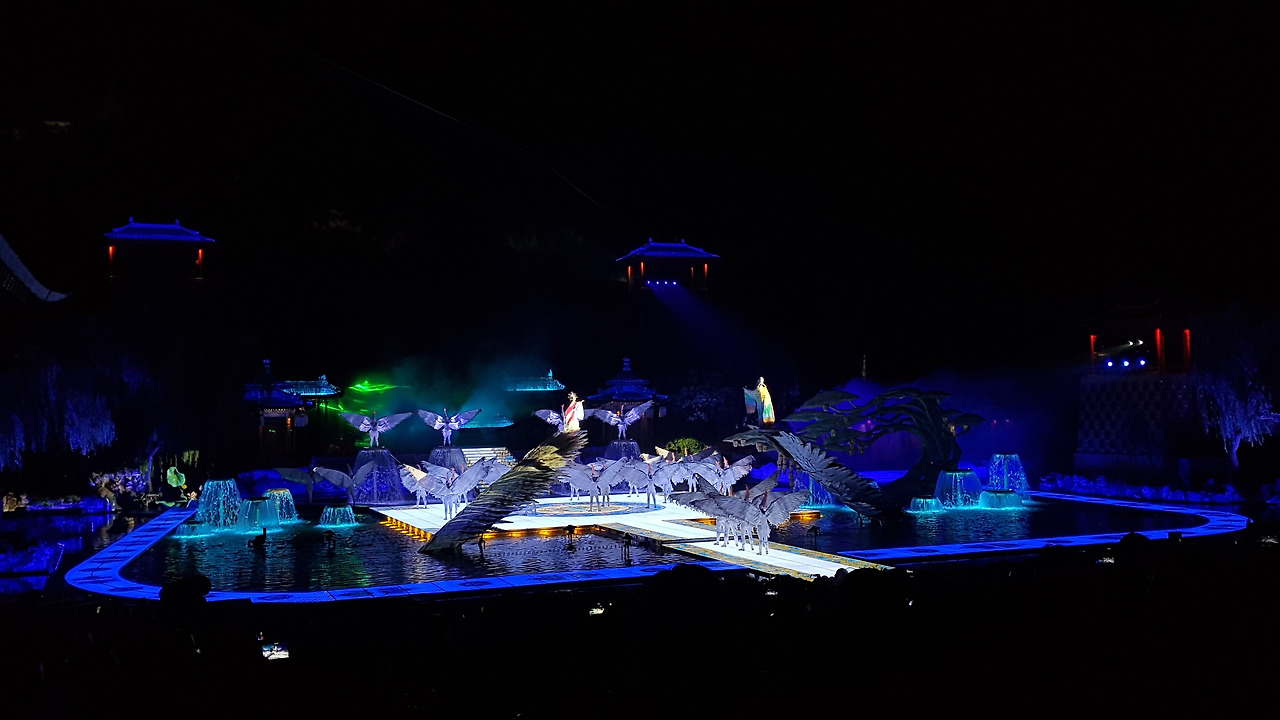 8시 10분, 일몰과 함께 공연이 시작되었다. 공연은 백거이(白居易)의 '장한가'에 근거해서, 당 현종과 양귀비가 만나게 되고, 당 현종이 며느리였던 양옥환을 황후로 들이고, 중국어로 정말 轰轰烈烈하게 사랑하다가 안록산의 난으로 양귀비를 떠나보낸 뒤에도 그녀를 잊지 못하는 그 마음을 표현한 작품이었다. 사실 주변이 소란스러워서 공연 내용을 따라가긴 어려웠지만 무대 장치나 소리 등으로 흐름을 파악할 순 있었다.