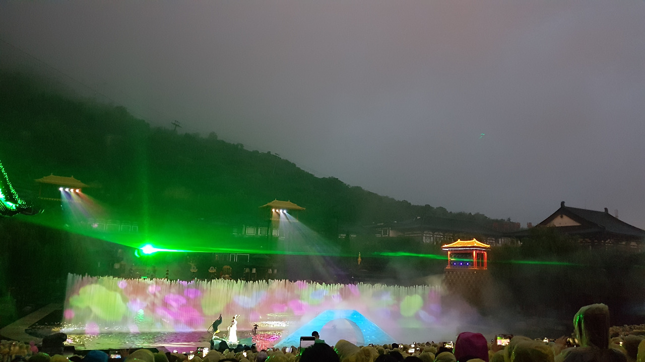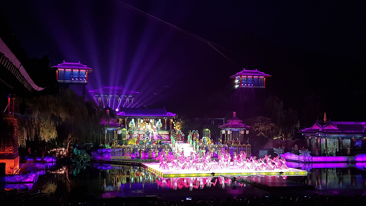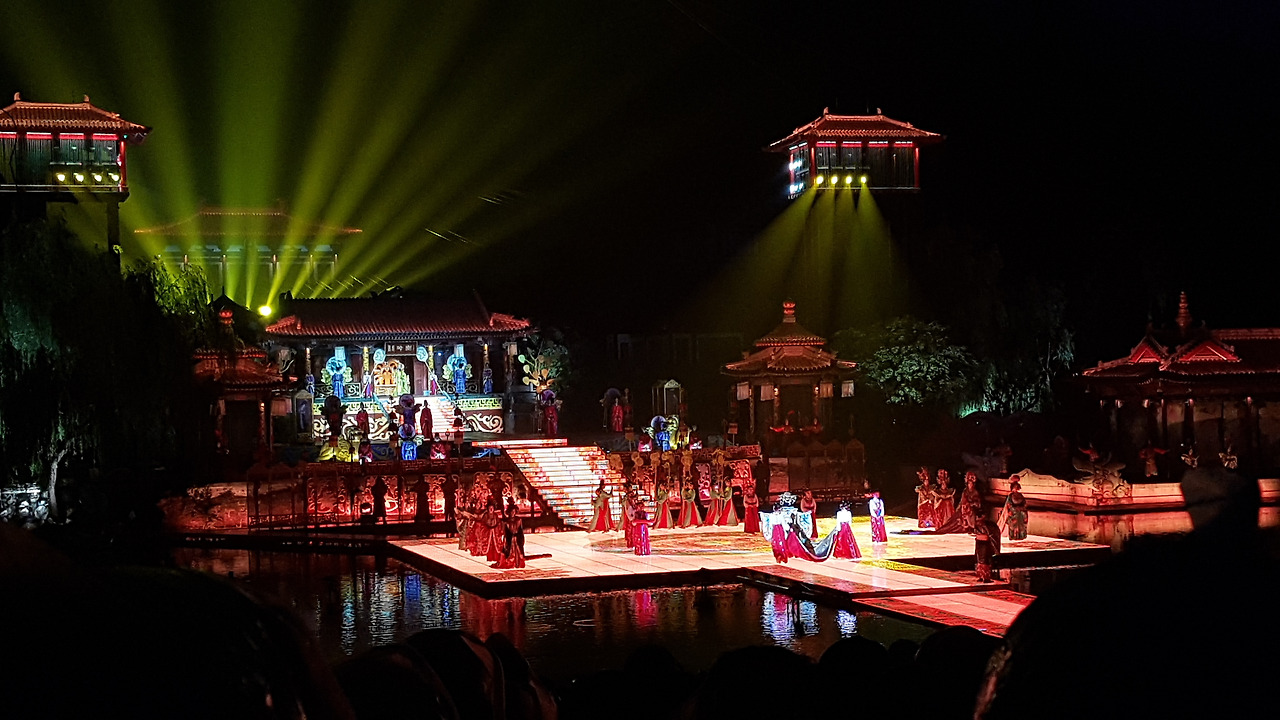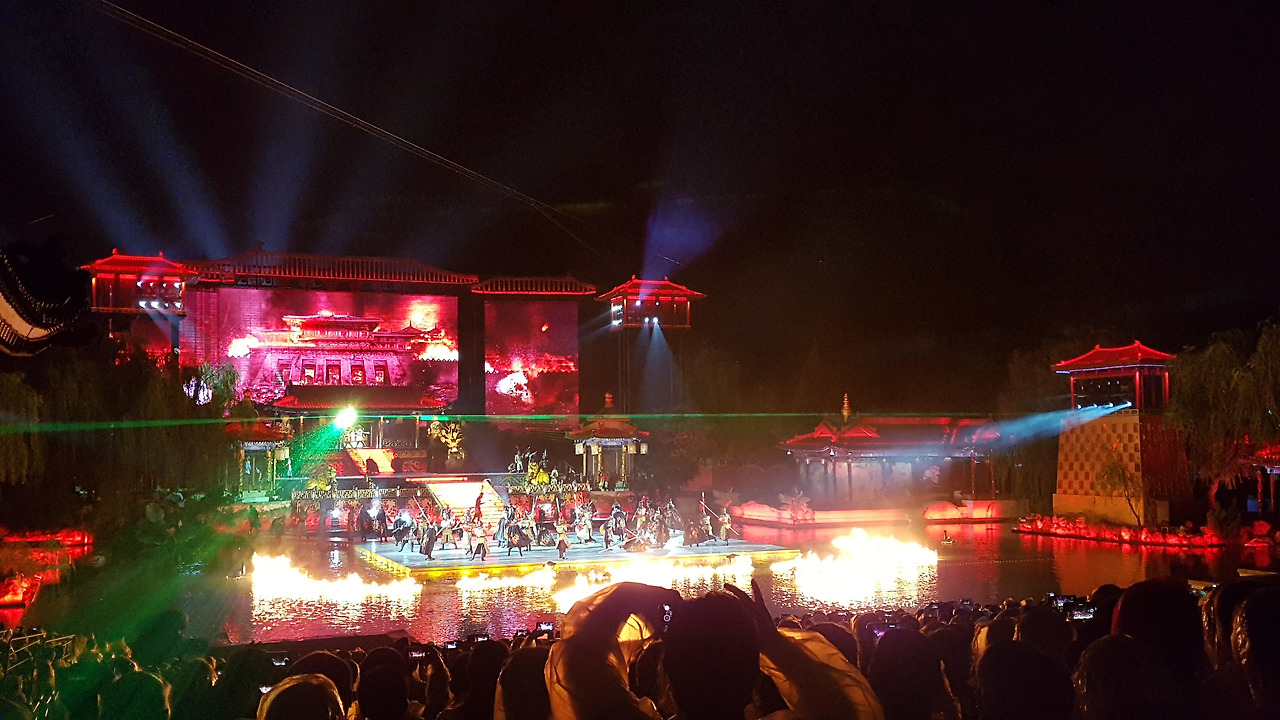 8시 10분, 일몰과 함께 공연이 시작되었다. 공연은 백거이(白居易)의 '장한가'에 근거해서, 당 현종과 양귀비가 만나게 되고, 당 현종이 며느리였던 양옥환을 황후로 들이고, 중국어로 정말 轰轰烈烈하게 사랑하다가 안록산의 난으로 양귀비를 떠나보낸 뒤에도 그녀를 잊지 못하는 그 마음을 표현한 작품이었다. 사실 주변이 소란스러워서 공연 내용을 따라가긴 어려웠지만 무대 장치나 소리 등으로 흐름을 파악할 순 있었다.