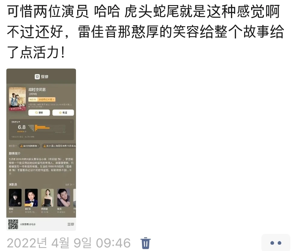 레이쟈인이 넘 좋아서 필모 찾아보다가 보게 된 영화. 남자주인공과 여자주인공의 시공간이 틀어져 서로 다른 시대를 살면서 한 집에 동거하게 되는 판타지인데, 약간 용두사미 같은 느낌이 있어서 배우가 아깝단 생각을 함. 또우빤에서도 레이쟈인 찬양만 있음.. ㅋㅋ