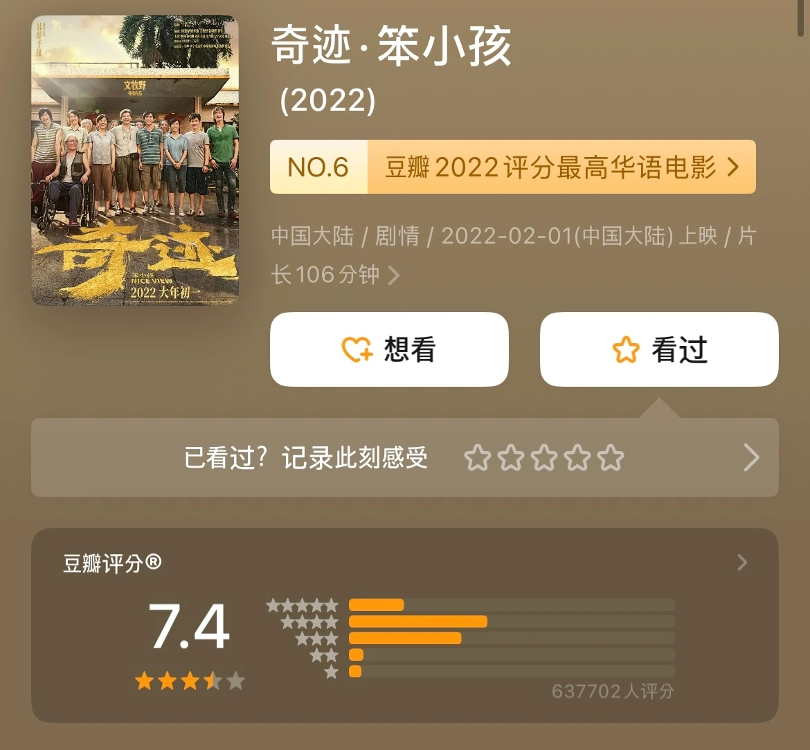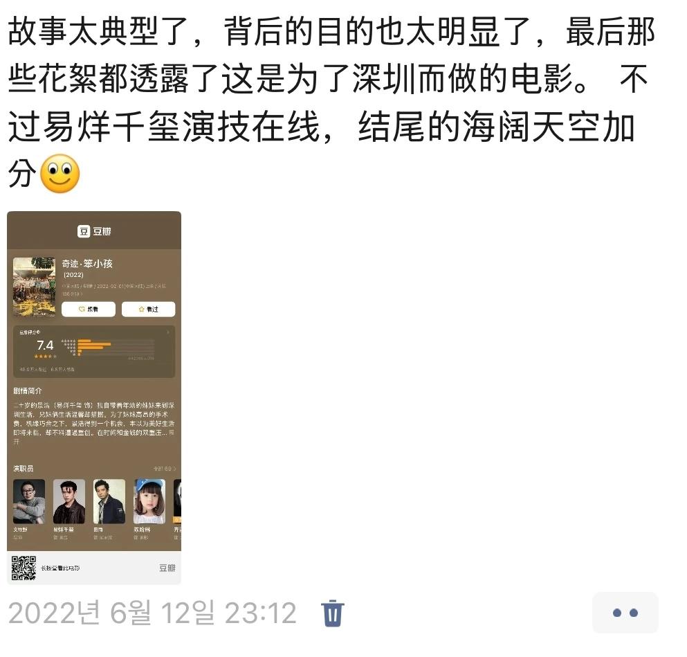 22년 춘절에 공개된 贺岁片. 이양쳰씨易洋千玺 주연으로 주목 받았음. 贺岁片이 그렇듯... 가족끼리 볼 수 있는 감동적인 스토리, 다 좋은데.. 결말이 해피엔딩일 게 너무 뻔해서 보는 내내 몰입이 잘 안됐음. 또우빤의 중국인들 평점이 한국보다 안 좋은 이유도 이런 진부함 때문인듯. 현실이 너무 힘드니까. 마지막 쿠키영상은 이 영화가 심천의 발달사를 보여주기 위해 만든 건 아닌가 하는 착각마저 불러일으킴.