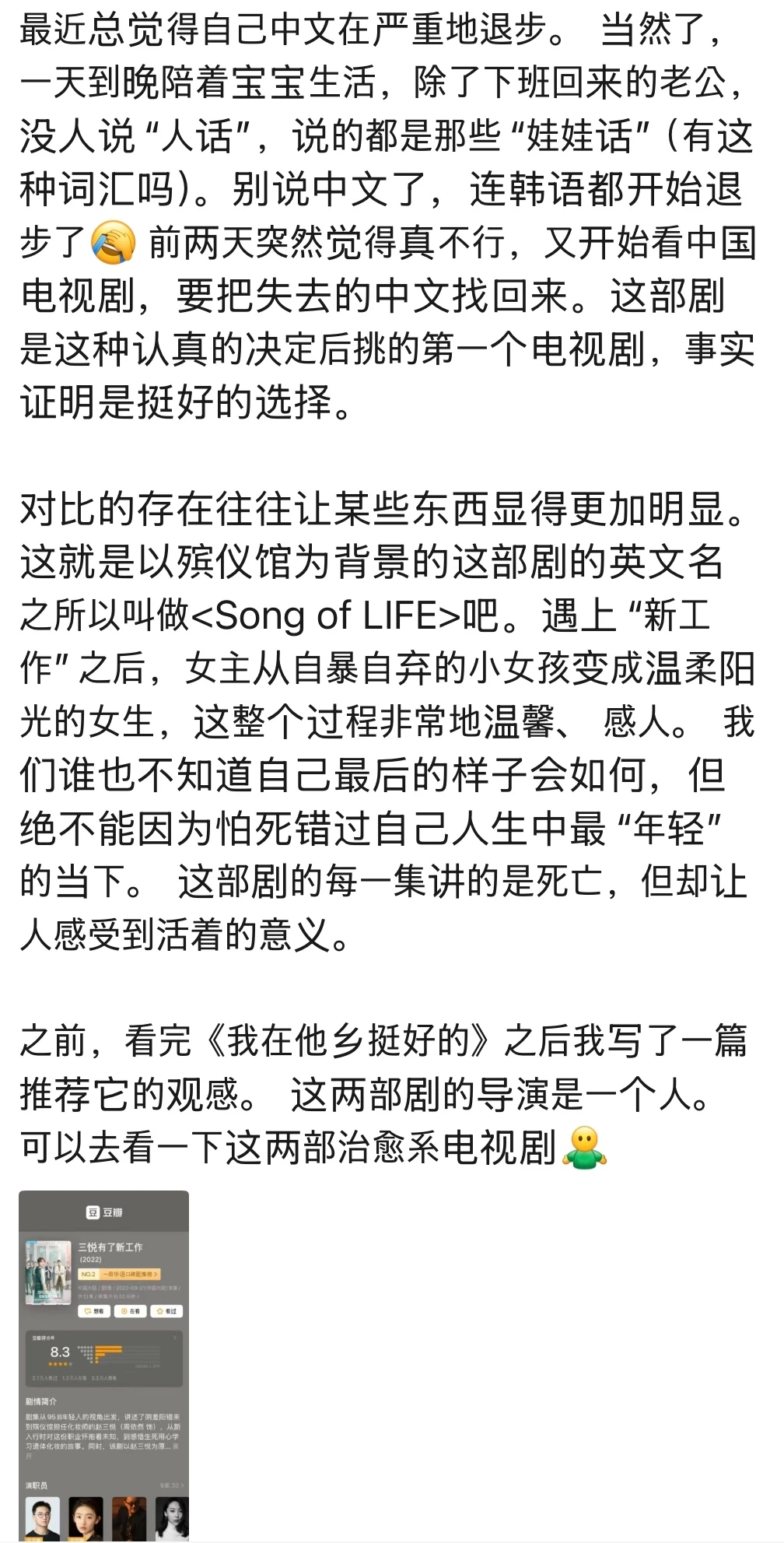 예전에 리뷰를 올린 적이 있는 <아재타향정호적(我在他乡挺好的)>와 같은 감독의 드라마라고 한다. 그래서 그런가 두 드라마의 느낌이 비슷하다. 둘다 치유계 드라마.