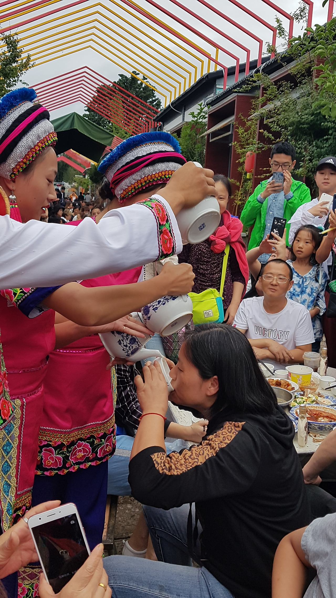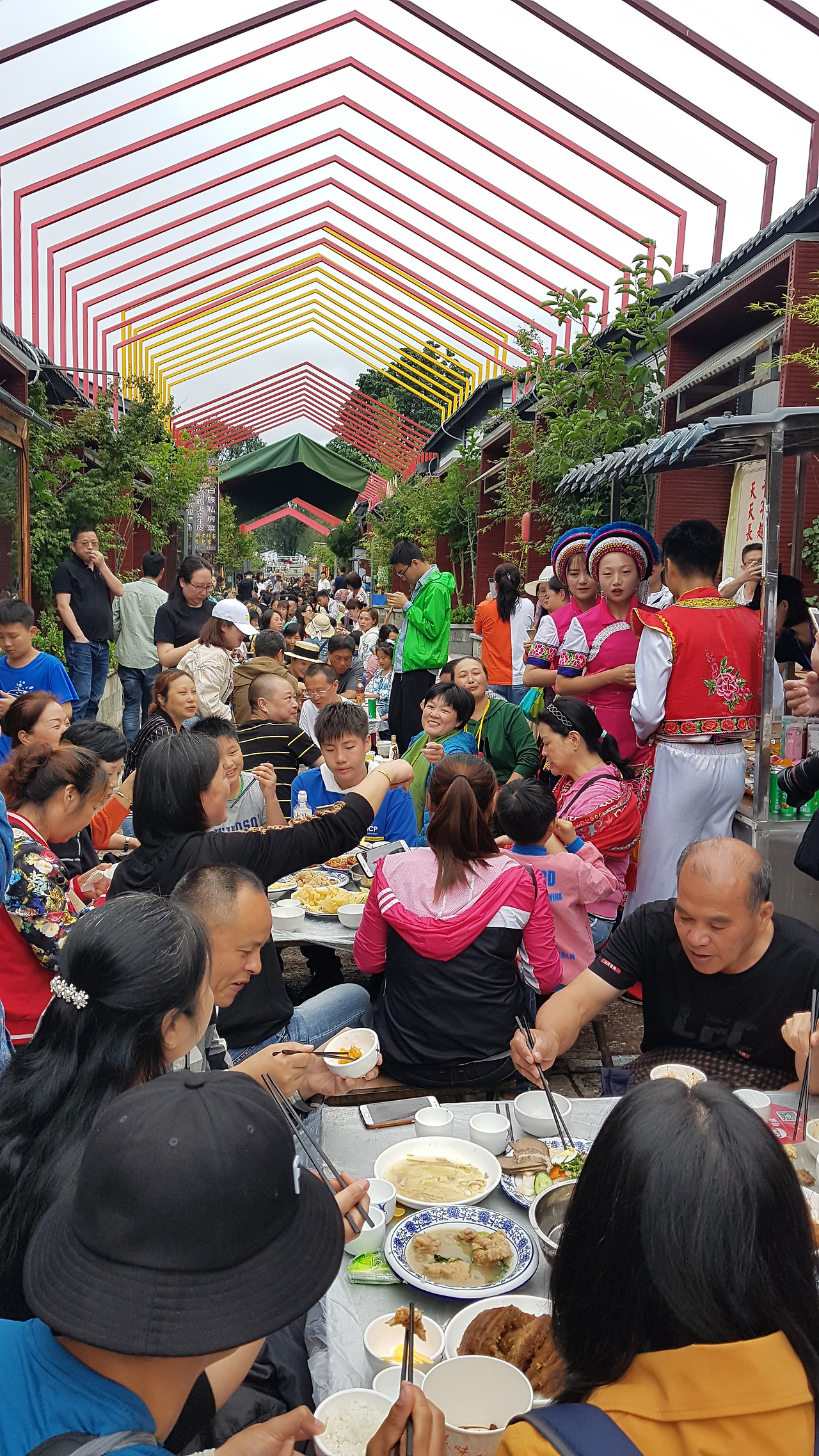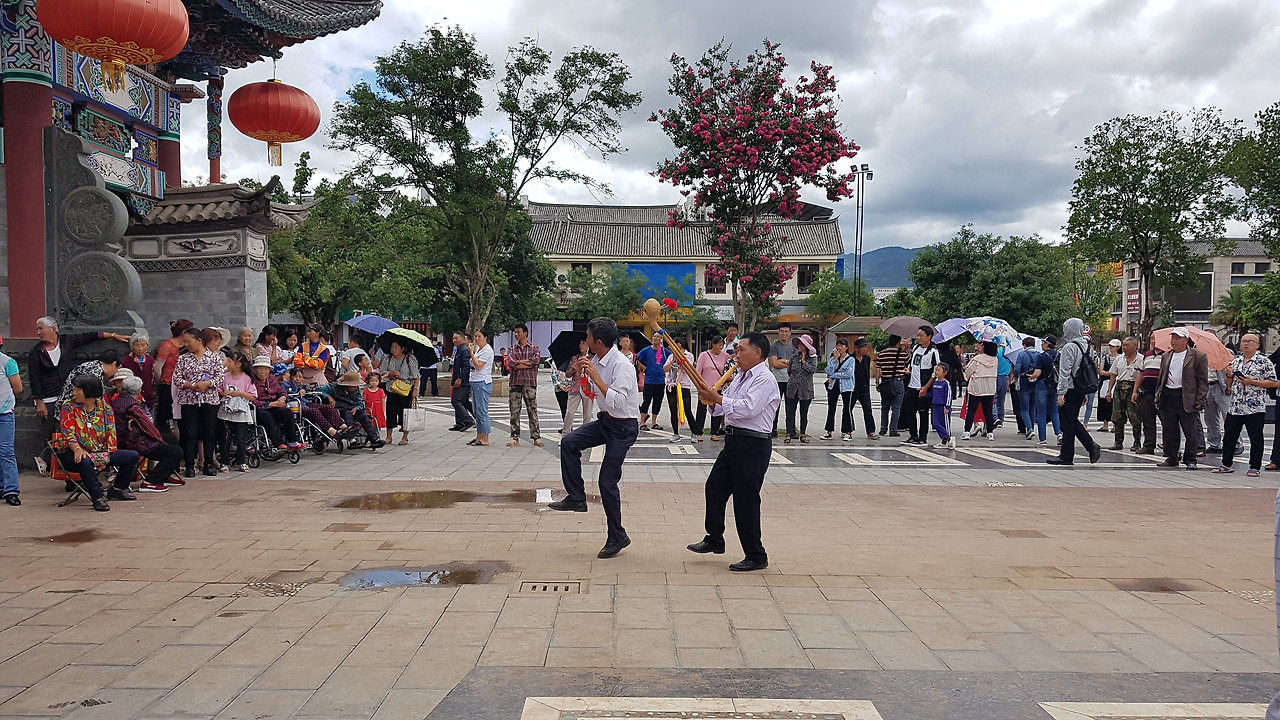 이런 식으로 길을 따라 길게 식탁이 차려져 있고, 빈자리에 알아서 착석하고 기다리면 행사 시작과 동시에 바이족 의상을 입은 사람들이 식탁에 음식을 가져다준다. 음식은 지역 특색 요리로 차려진 듯했는데, 조리한 지 오래되어 이미 거의 다 식어버린 음식들이었다. 그냥 기분 내는 정도로만 맛보도록 하자.