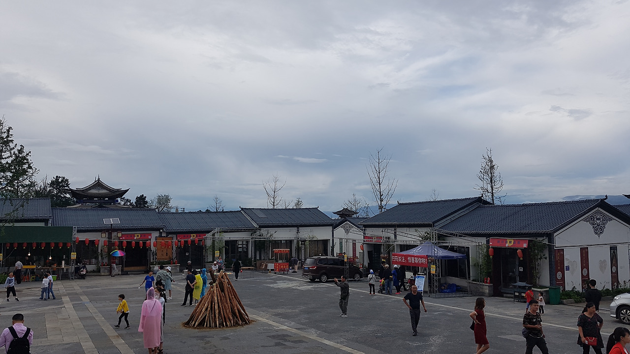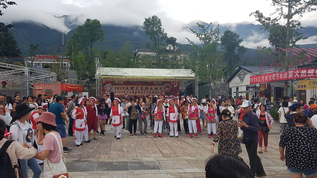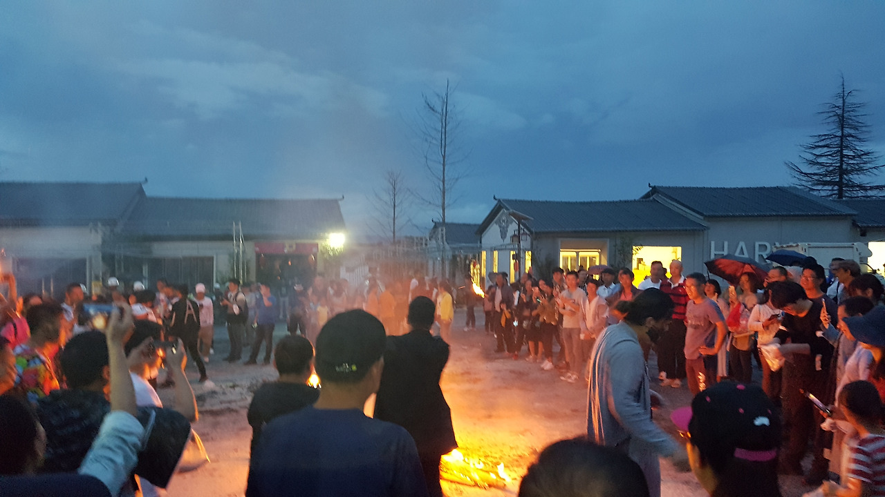 장가연이 끝나고 드디어 이날의 하이라이트, 훠바지에 행사장에 간다. 훠바지에(火把节)는 문자 그대로 직역하면 횃불 축제인데, 앞서 이야기했던 것처럼 바이족에만 있는 축제가 아니라 이족, 나시족 등 운남 지역의 다른 민족들에게서도 볼 수 있는 축제다. 대체로 음력 6월 24일, 25일에 진행된다. 해질 무렵부터 큰 불을 피울 땔감 등을 준비하고 기다리다가, 해가 지면 불을 붙이고 그 주변에서 춤도 추고 노래도 부르며 풍년과 가축의 다산을 기원한다.