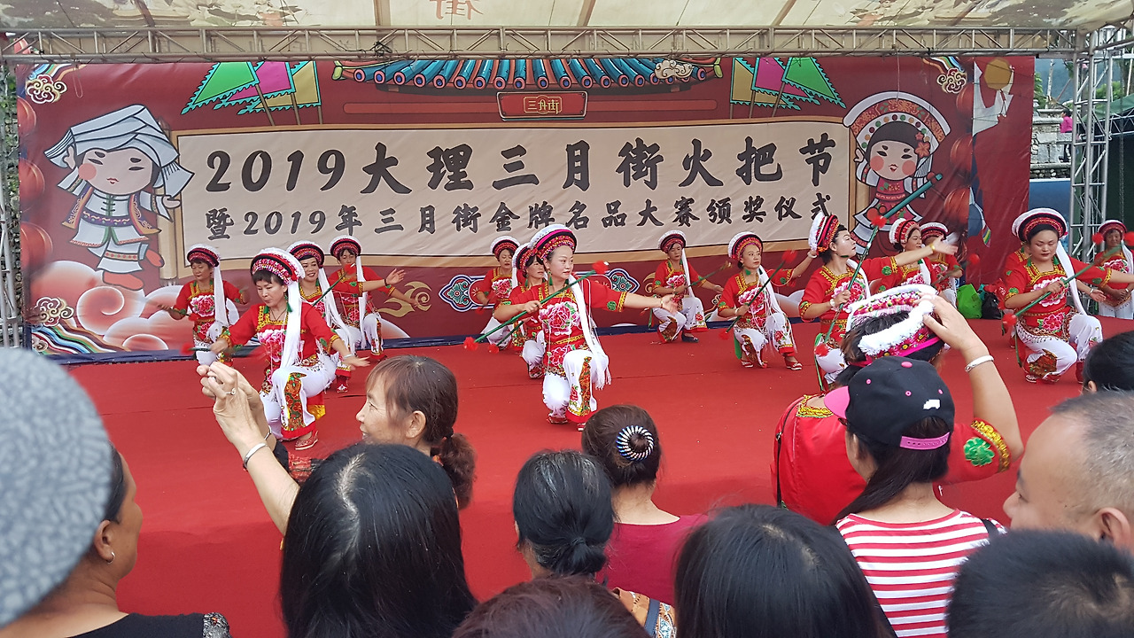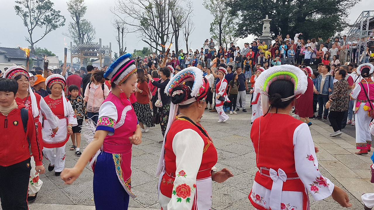 어쨌든 활활 타오르는 불을 가운데 두고 사람들과 모여 행복한 시간을 보내는 것이 결국 이 행사의 본질이 아닐까 한다. 우리도 처음 보는 누군가와 둥글게 서서 불을 사이에 두고 빙글빙글 돌며 흥겹게 축제를 즐겨보았다. '횃불축제'라는 이름에 맞게 원하는 사람은 횃불을 들고 돌기도 했고, 중간중간 바이족 언니들의 전통무용 공연도 볼 수 있었다.