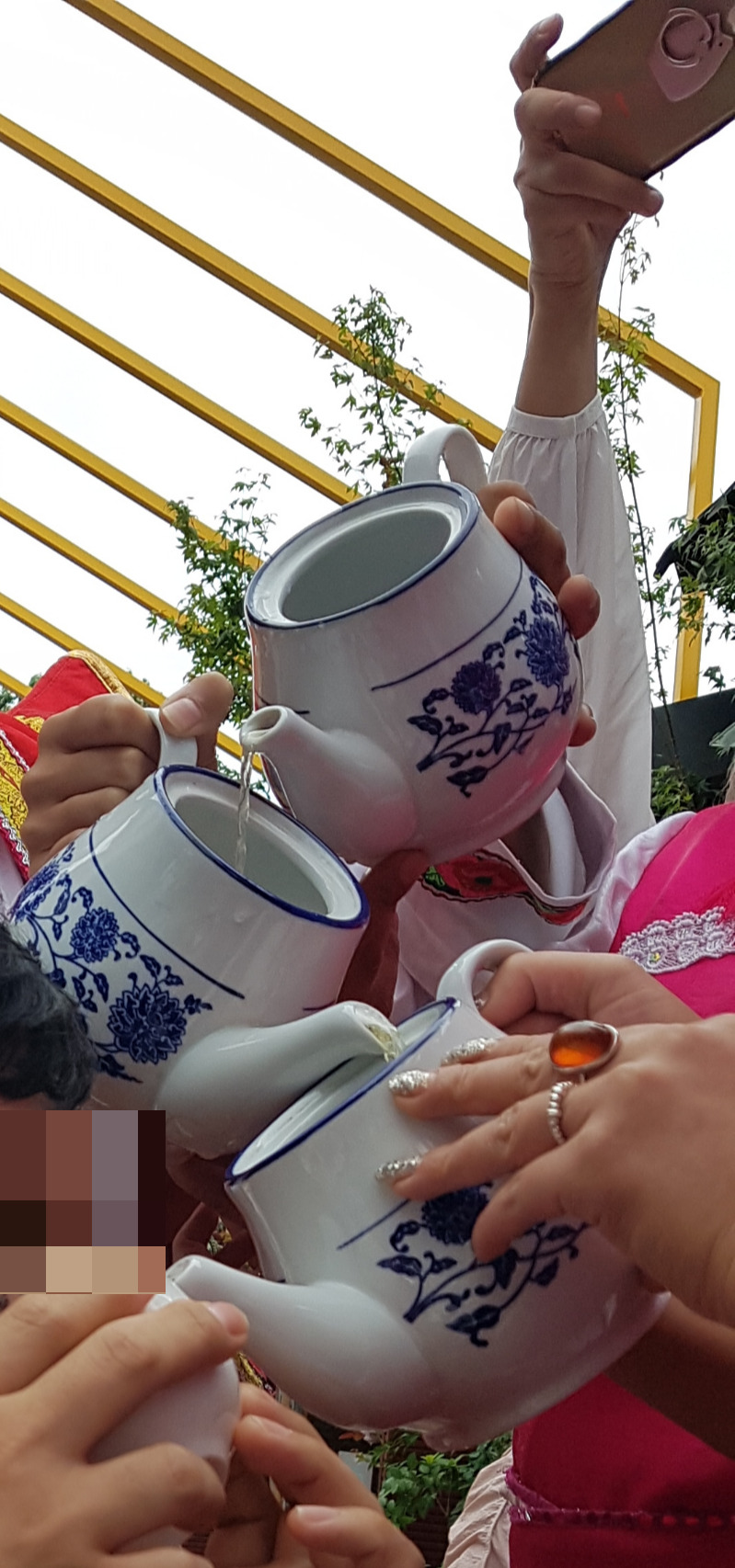 사실 이 장가연의 하이라이트는 바로 이 고산유수(高山流水)였다. 어느 민족의 행사를 가나 새로운 손님에 대한 환영의 의미로 란먼주(拦门酒)라는 의식을 하는데, 이날은 ‘높은 산에서 물이 흐른다’는 이 고산유수라는 형태로 환영 의식을 진행했다. 테이블별로 지원자 한 명을 받아 진행했는데, 바이족 직원들이 와서 지원자에게 잔을 들게 하고, 주전자 세 개를 세로로 놓고 맨 위에서 술을 부어 흘러나온 술을 마시게 한다. 새 친구의 장수와 복록을 기원하며 하는 환영 의식이다. 후래자 삼배를 생각나게 하는 건 왜일까... 어쨌든 이 고산유수로 나름대로 즐거웠던 장가연이었다.