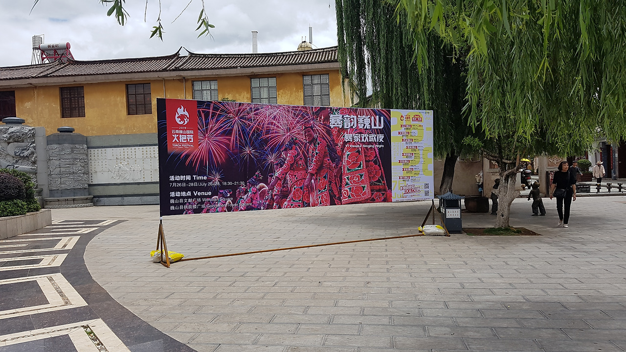 민속박물관을 다 둘러본 뒤, 슬슬 훠바지에(火把节) 참가를 위해 축제가 열리는 행사장으로 이동하기로 했다. 빠오처 기사와 만나기로 한 고성 문 앞에 도착하여 차를 기다리는데, 이족의 훠바지에 행사 포스터가 눈에 띈다. 이족의 훠바지에는 바이족의 그것보다 하루 일찍, 그러니까 음력 6월 24일에 진행한다. 아무래도 웨이샨은 이족 자치현이라 바이족의 그것보다는 더 크게 행사를 하는지 프로그램이 꽤 알차 보인다. 어쨌든 우리가 표를 산 건 바이족의 훠바지에이니, 거기로 가는 걸로.
