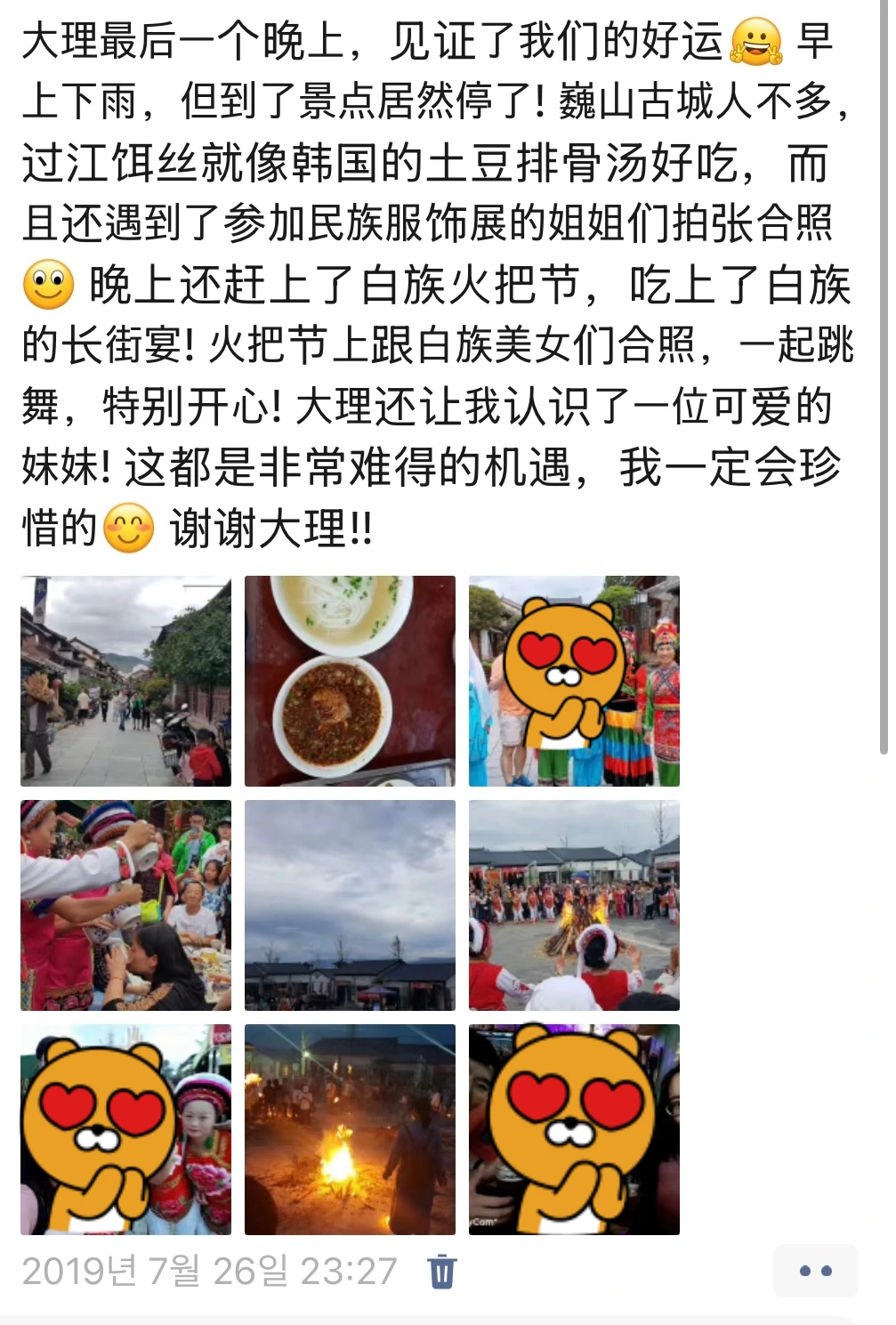 (譯) 따리에서의 마지막 밤, 우리의 운 좋음을 증명해 냈다! 아침에 비가 오긴 했지만, 목적지에 도착하니 비가 그쳤다! 웨이샨 고성은 사람이 적었고, 궈쟝얼쓰는 한국의 감자탕처럼 맛있었다. 게다가 민족복장 전시회에 참여하는 언니들을 만나 사진도 찍었다. 저녁에는 바이족 훠바지에에 참가해 바이족의 장가연에서 음식도 먹었다. 훠바지에에서 바이족 언니들과 사진도 찍고, 같이 춤도 추니 정말 즐거웠다. 따리에서는 귀여운 여동생도 하나 알아가게 되었다. 이 모든 것이 참 쉽지 않은 만남들이라, 소중하게 여길 생각이다. 고마워, 따리!