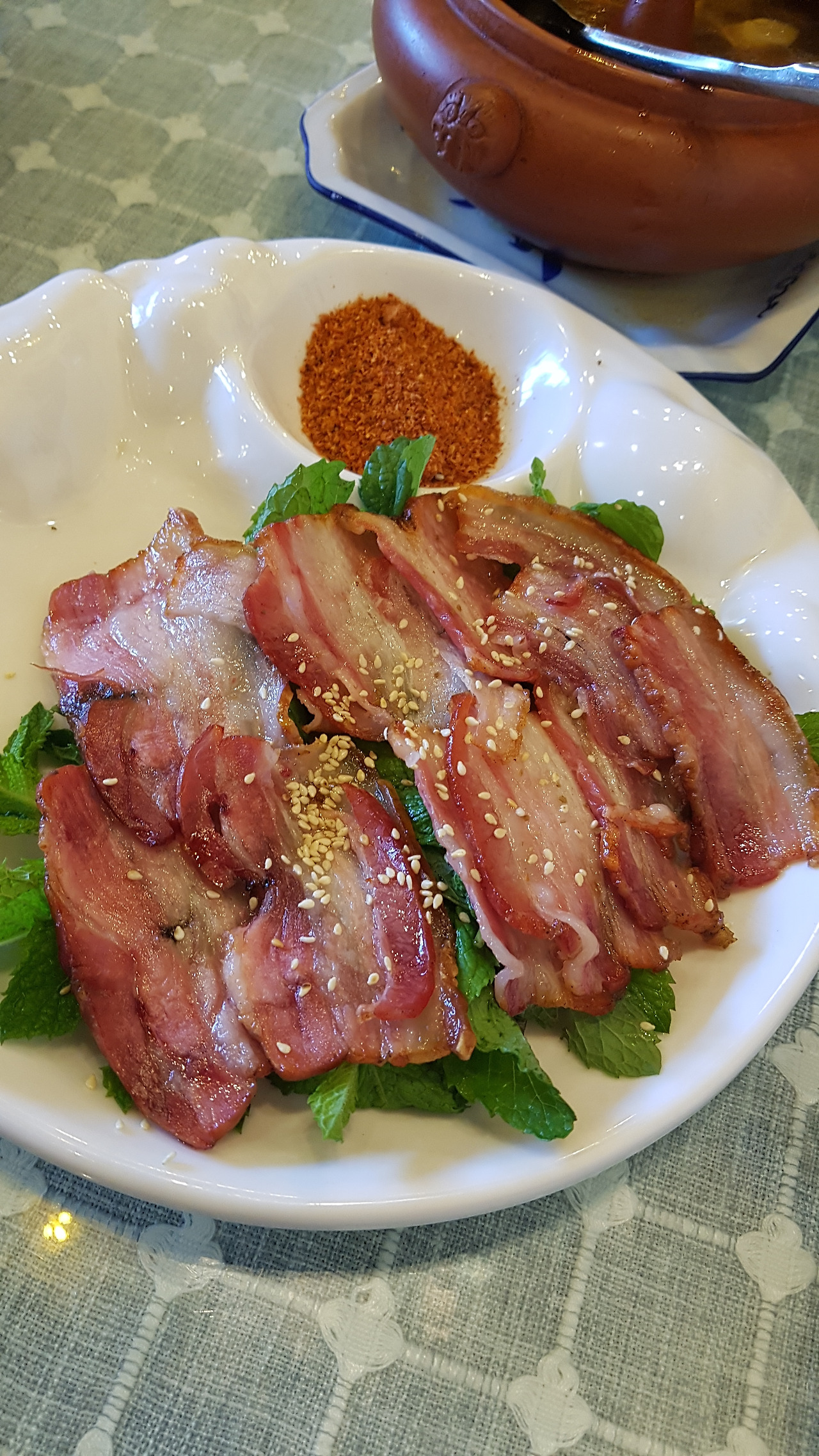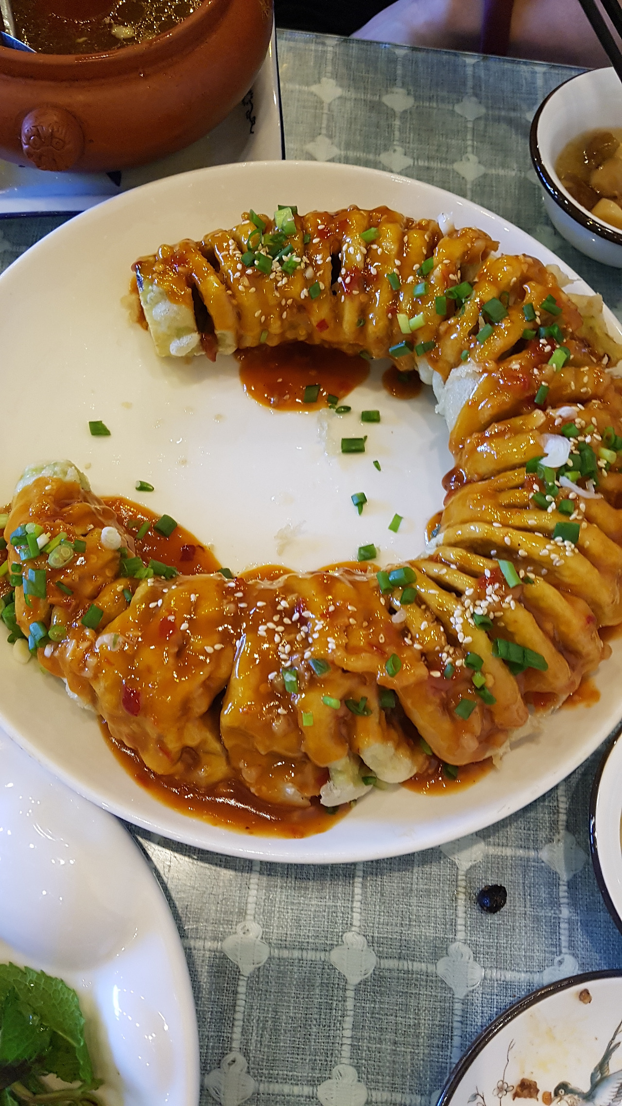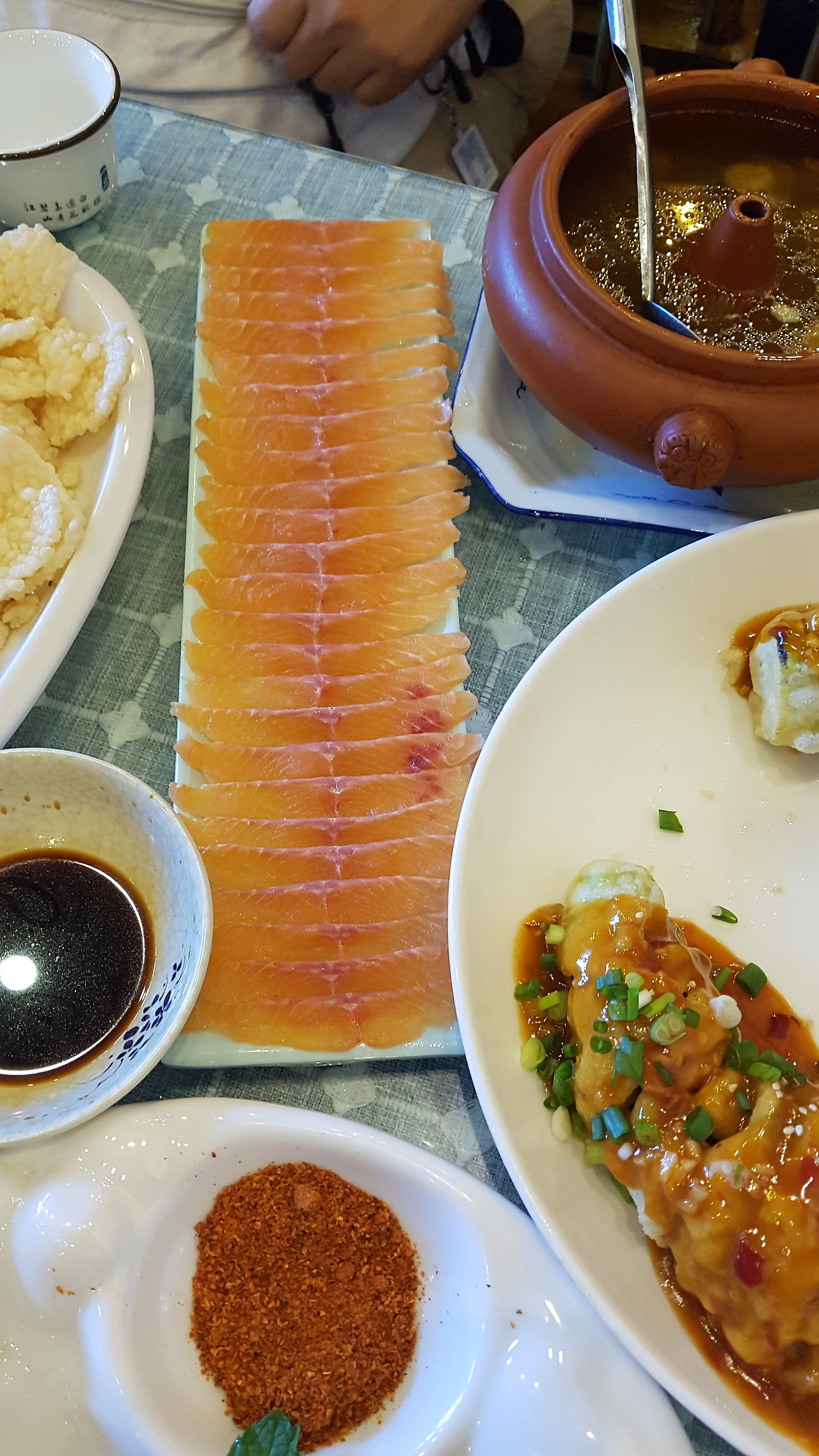 안전한 메뉴 외에 시켜본 메뉴는 가지를 칼집을 내어 튀긴 후 소스를 얹어주는 过江茄龙(가지로 만든 용이 강을 건넌다는 뜻), 그리고 향료를 써서 말린 고기를 구워서 만드는 나시족 고기 구이(纳西烤肉), 그리고 좀 뜬금없어서 시켜본 연어회 플래터(三文鱼刺身拼盘). 三文鱼가 salmon의 음차어로 알고 있어서 우리가 아는 그 연어인 줄 알았는데, 알고 보니 리쟝의 三文鱼는 송어를 가리키는 거였다! 느끼한 중국음식 많이 먹다가, 덕분에 송어회 맛있게 먹었다. (2026년 3월 기준, 이 송어회 메뉴는 없어졌다 ㅠㅠ)