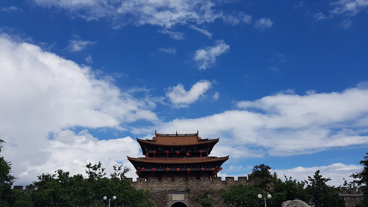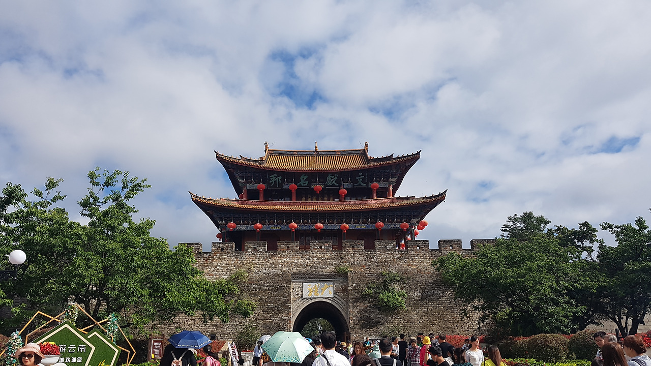 "떠날 때서야 날이 개네!" 운남에서의 여섯 번째 날 아침, 체크아웃을 하고 숙소를 나오자마자 일행들과 이구동성으로 이렇게 말했다. 돌이켜보면 우리의 운남 일정은 대부분 우산과 함께였다. 폭우든 이슬비든 비가 완전히 갠 적이 거의 없었고, 우양산이 양산의 기능보다는 우산의 기능을 더 많이 했다. 특히 따리에서는 폭우를 만나 실내에 거의 갇히다시피 한 적도 있었는데, 드디어 그 비가 그친 것이다. 푸른 하늘 아래 따리 고성의 남문은 더 웅장하고 멋지게 보였다.