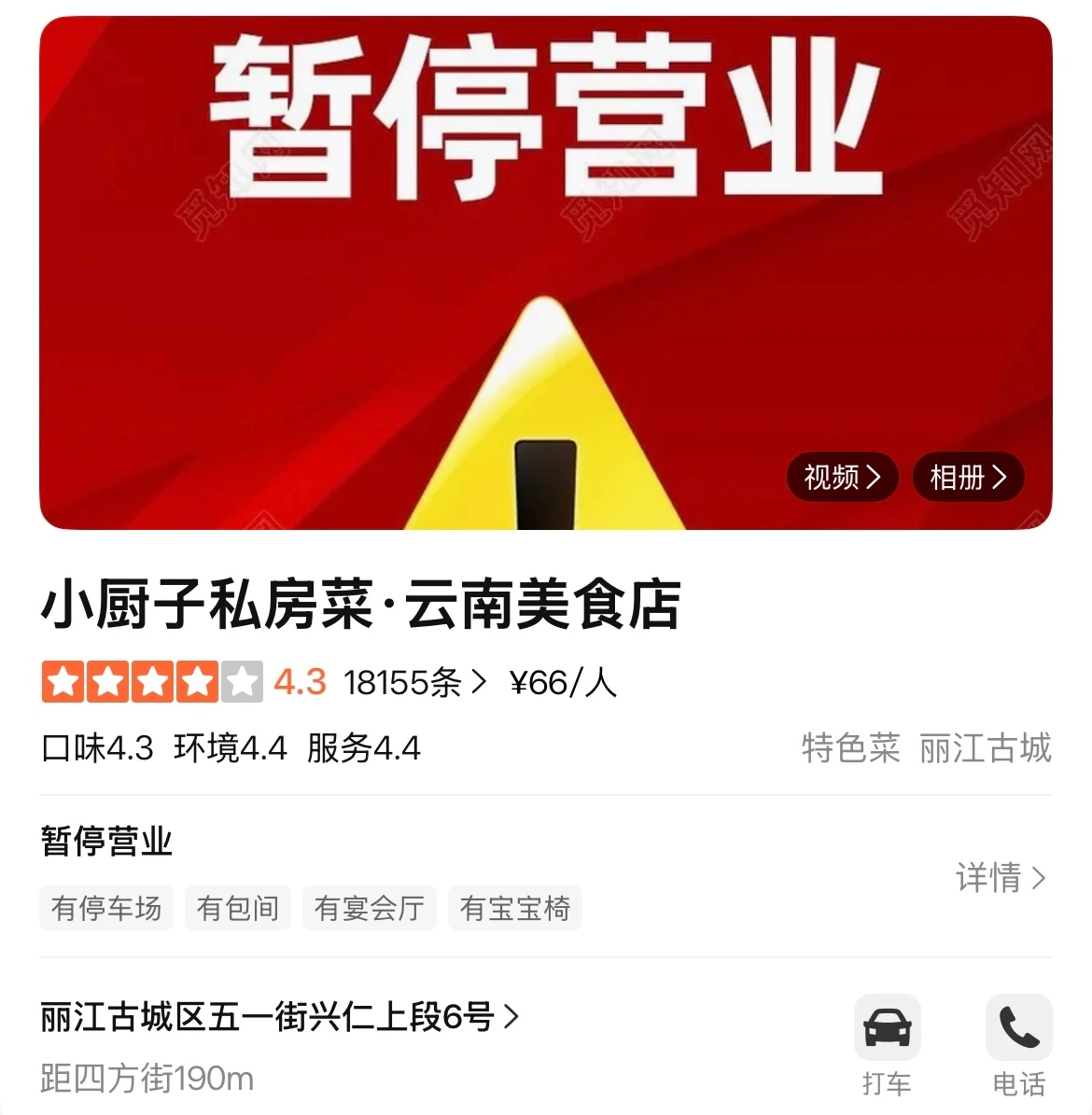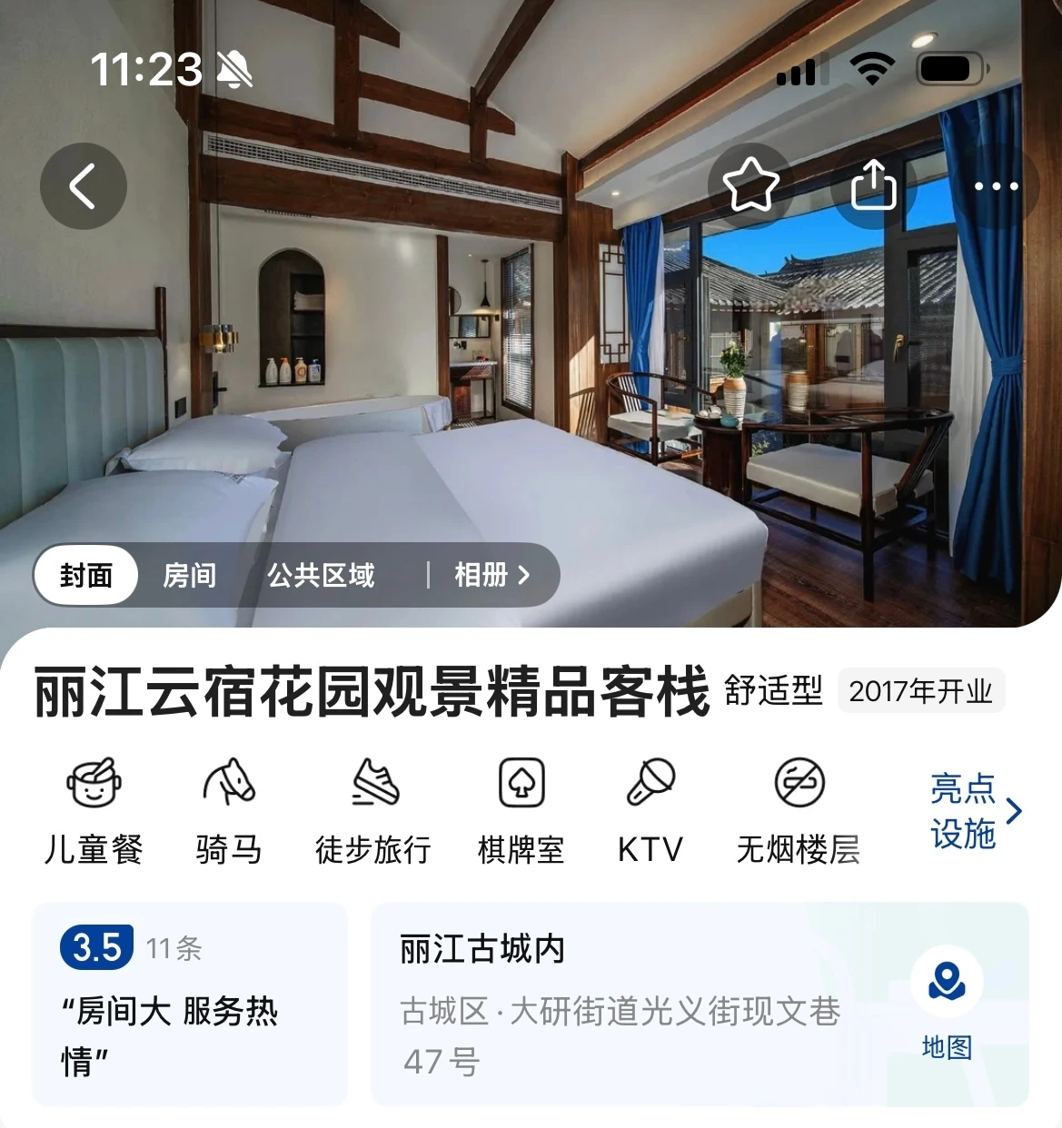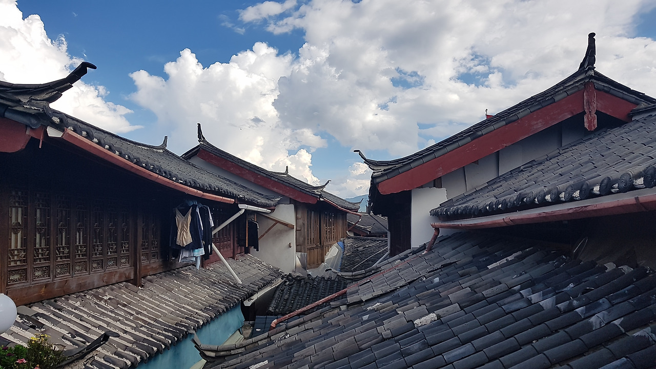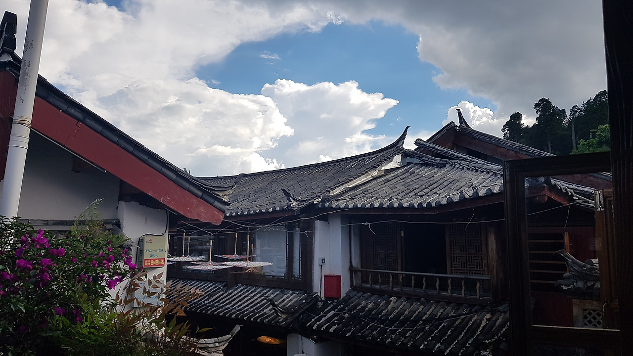 2026년 3월 기준, 해당 숙소는 영업은 안 하는 것 같고, 따중뎬핑에 정보는 올라와있다. 핑야오 고성에서 객잔에 묵었을 때처럼, 다소 고풍스러운 나무 명패가 달린 열쇠를 준다. 숙소에 들어가 짐을 풀고 창 밖을 보니, 오는 길에 우리를 괴롭혔던 우산길도 보이고, 따리고성의 그것과는 또 다른 리쟝고성 건물들의 지붕이 눈에 들어온다. 방에 따라 옥룡설산(玉龙雪山)이 보이는 곳도 있는 듯했는데, 아쉽게도 내 방에서는 보이지 않았다.