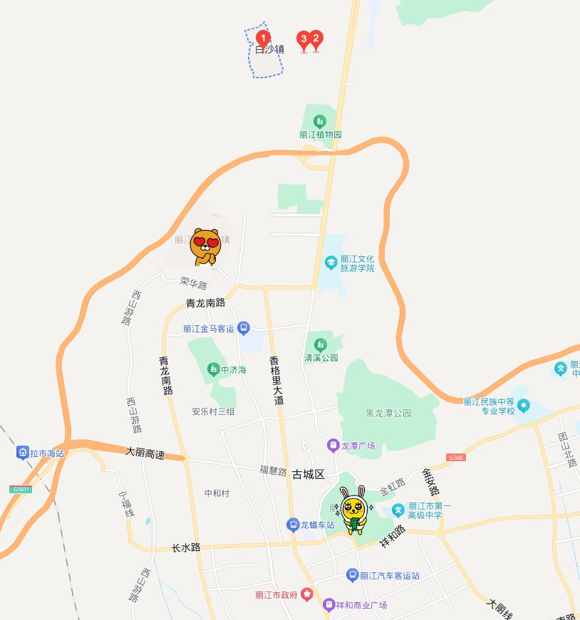 지도에서 토끼모양 무지가 있는 곳이 리쟝고성, 라이언이 있는 곳이 수허고진, 1번이라고 표시된 곳이 바이샤고진이다. 나시족은 가장 초기에 바이샤고진에 정착했다가 이후 수허고진으로 이동, 마지막에 현재 리쟝고성 자리에 정착하여 토사의 저택인 목부를 세웠다고 알려져 있다. 현재 가장 많은 관광객이 방문하는 리쟝고성이 사실은 제일 마지막에 세워진 나시족의 마을인 셈이다. 만주족으로 치면 선양이 바이샤고진, 베이징이 리쟝고성이라고 볼 수 있다.