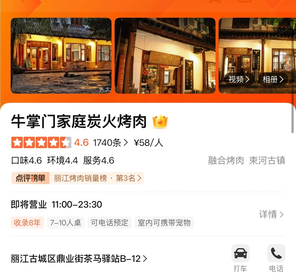 박물관 구경을 마치고 나오니 벌써 오후 한 시가 넘었다. 다음 목적지에 가기 전에 요기를 해야 할 시간이다. 재빨리 주변 맛집을 검색해 보는데, 특이한 메뉴가 눈에 띄었다. '숯불 바베큐(炭火烤肉)'. 이름을 봤을 때 리쟝 요릿집은 아닌 것 같은 느낌이 물씬 풍겼다. 고성에서 나시족 고기구이를 먹어보긴 했지만, 그건 염장한 고기를 구운 거라 숯불 바베큐와는 거리가 멀었기 때문이다. 후기를 찾아보니 한국 고깃집에서 쓰는 불판이 나온다. 운남 요리를 영 입에 안 맞아하던 일행들의 침 넘어가는 소리가 들린다. 괜찮을까? 밑져야 본전이다. 가보자!
