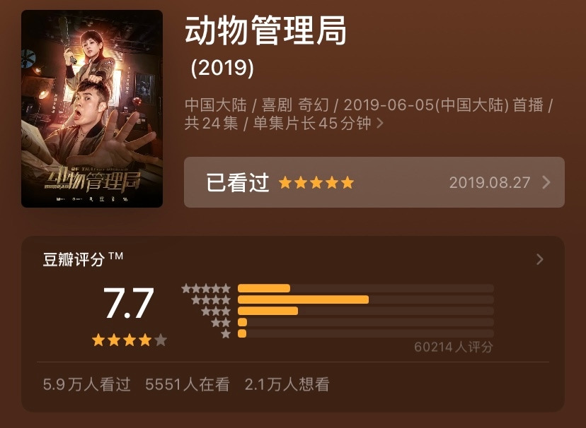 본래 제목은 <요괴관리국>이었다는 이 드라마는 19년 6월, 아이치이(iQIYI, 爱奇艺)를 통해서만 배포된 웹드라마입니다. 제목이 <요괴관리국>에서 <동물관리국>으로 바뀐 건 지나치게 판타지 한 요소, 그중에서도 요괴나 귀신 소재를 그다지 좋아하지 않는 중국 당국의 심의를 비껴가기 위한 조치로 해석할 수 있을 것 같습니다. 웹드라마여서 그런지 24부밖에 되지 않는 이 드라마는, 기본이 40부작인 다른 중국 드라마에 비해 짧은 편이죠.
