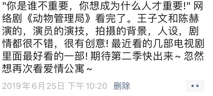 [譯] "네가 누구인지는 중요하지 않아. 네가 어떤 사람이 되고 싶어 하는지가 중요하지!" 웹드라마 <동물관리국>을 다 봤다. 왕즈원(王子文)과 천허(陈赫)가 나오는 드라마인데, 배우들의 연기, 촬영한 배경, 인물 설정, 스토리 모두 좋았고 창의적이었다. 최근 봤던 드라마 중에서 가장 재밌었던 드라마다. 시즌 2가 얼른 나왔으면 좋겠다. 갑자기 <아이칭꽁위(爱情公寓)>가 다시 보고 싶네~
