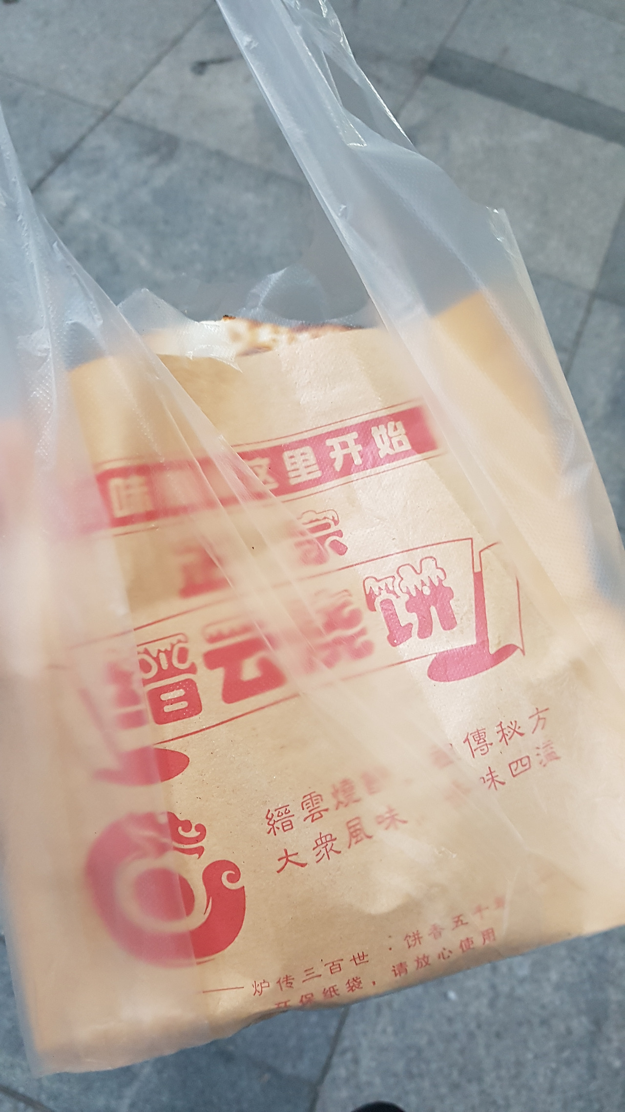 중국의 각 지역마다 지역 특색의 샤오빙이 있는데, 오늘 내가 먹은 샤오빙은 절강성(浙江省) 특색의 샤오빙인 진윈샤오빙(缙云烧饼)이었다. 토핑은 나의 최애 토핑 메이깐차이(梅干菜). 무청 같은 채소를 소금에 절여 말린 것인데, 바삭한 샤오빙에 짭짤한 맛을 더해줘 꼭 필요한 친구다. 목이 막힐 수도 있으니 쩐주나이차(珍珠奶茶)도 하나 사서 길에서 우걱우걱 먹으며 다음 목적지로 향했다. 누가 봐도 중국인의 모습이다. 현지화 성공!