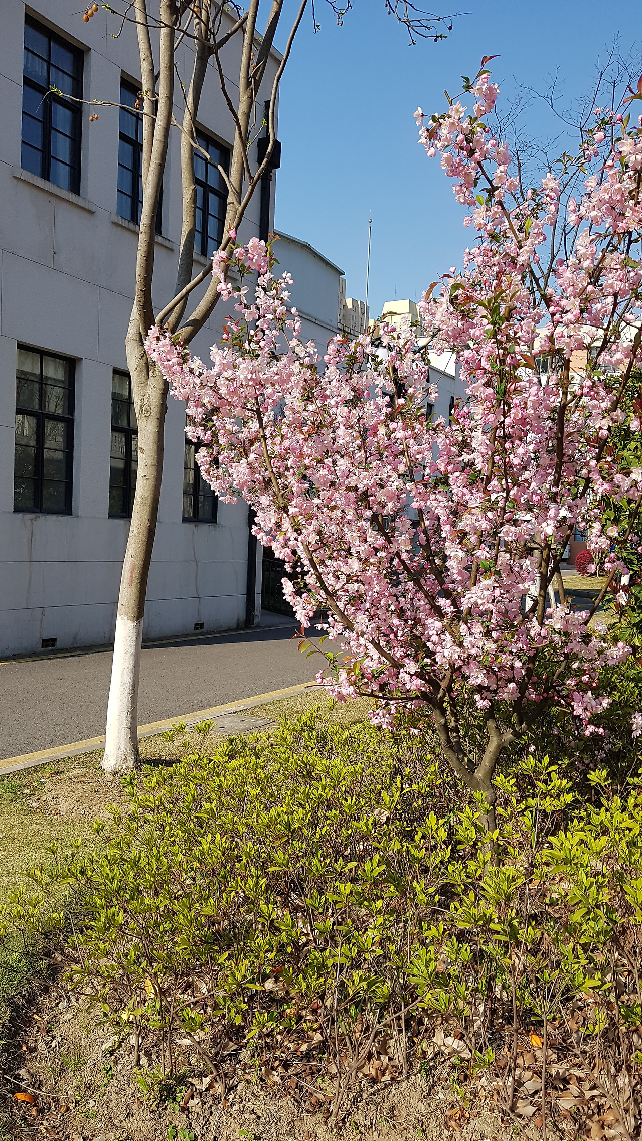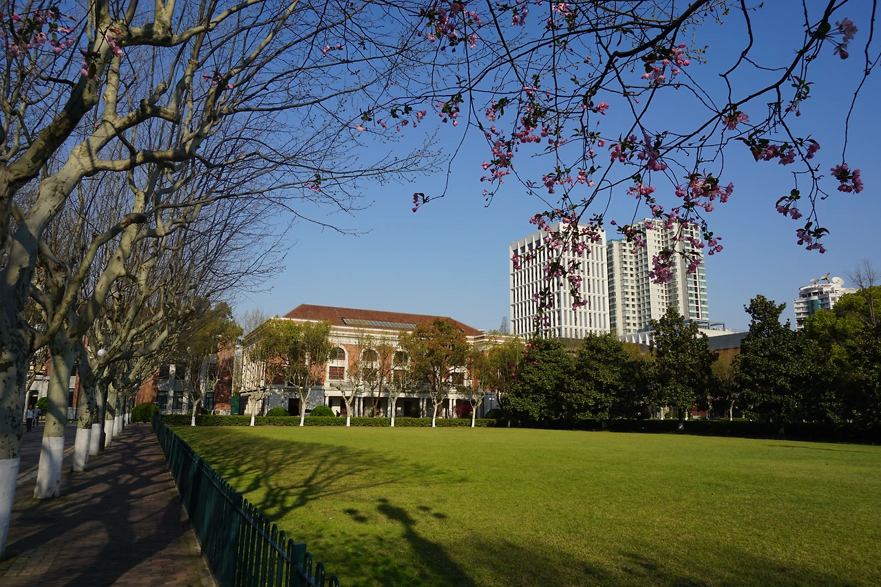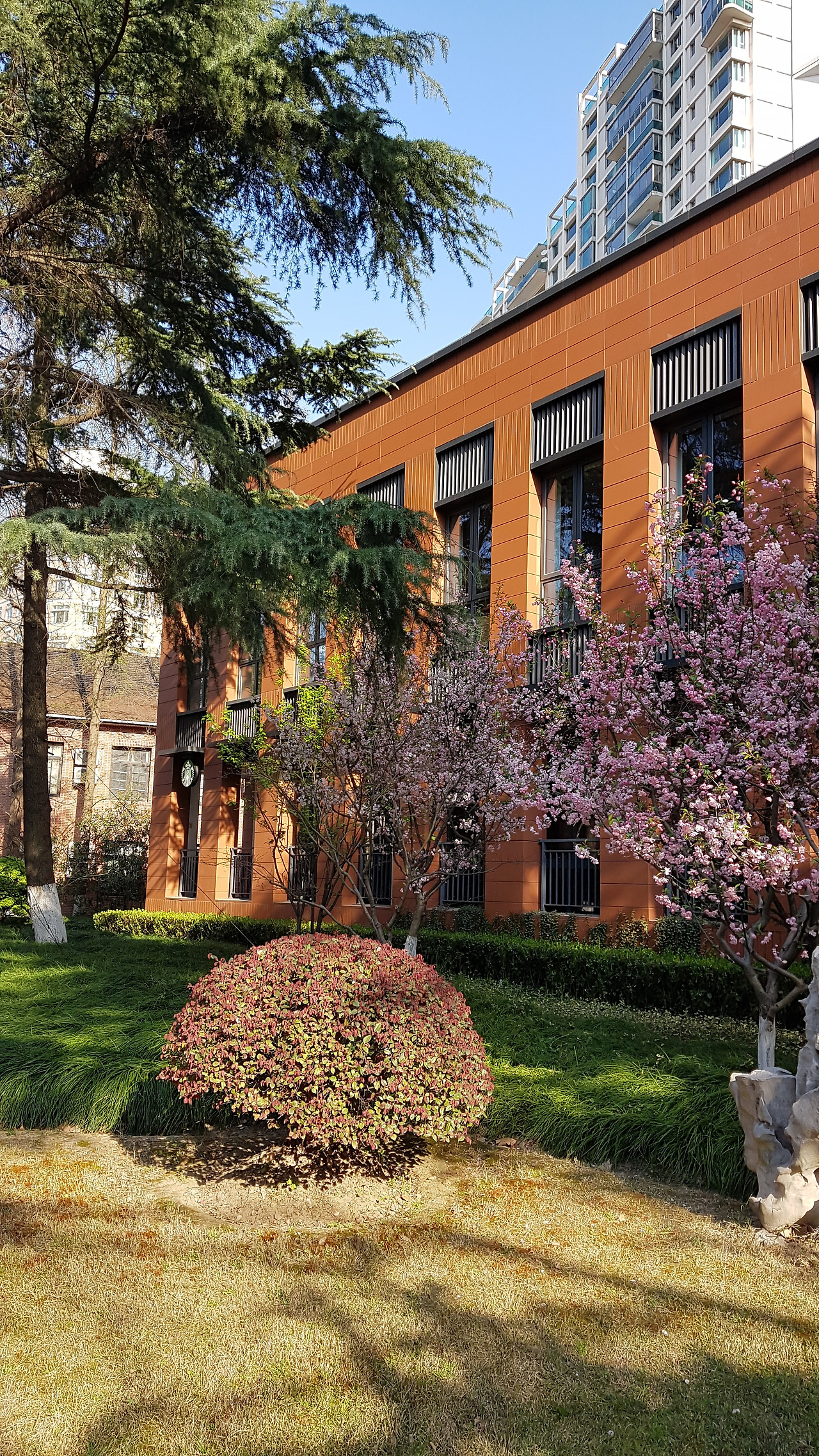아직 봄다운 봄을 맞이하지 못한 상해인지라 나무가 앙상하다고만 생각했는데, 자세히 보니 끄트머리에 분홍빛 꽃들이 매달려있다. 그 나뭇가지들이 공터에 드리운 그림자가 또 하나의 풍경을 만든다. 곧 이 나무에도 더 풍성하게 잎이 돋아나고 또 다른 풍경이 캠퍼스를 채우겠지. 우측 하단의 그림 속 비석은 백주년 기념비다. 이 날은 기념사진을 찍는 일정이 있을 예정인지 기념비 앞에 이미 촬영을 위한 간이 의자가 설치되어 있었다.