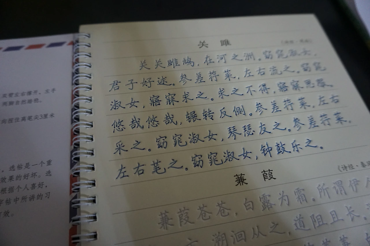 고서(古书) 속 문장들을 발췌해 필사하는 책인데, 어라? 첫 글이 어째 낯이 익다. <시경> 속 문장인데, '요조숙녀 군자호구(窈窕淑女,君子好逑)'라는 말이 포함된 관저(关雎)의 한 구절이다. <환락송(欢乐颂)> 속 부모님 말 잘 듣는 모범생 딸도 이 구절의 제목을 따 이름이 관쥐얼(关雎尔)이지. 왕카이(王凯)의 노래를 들으며 파란 펜으로 글씨를 쓱쓱 쓰고 있으니 마음도 진정되고 편해진다. 며칠 지나 다시 보니 정말 글씨가 지워져 있다. 가짜를 산 건 아닌가 보다.