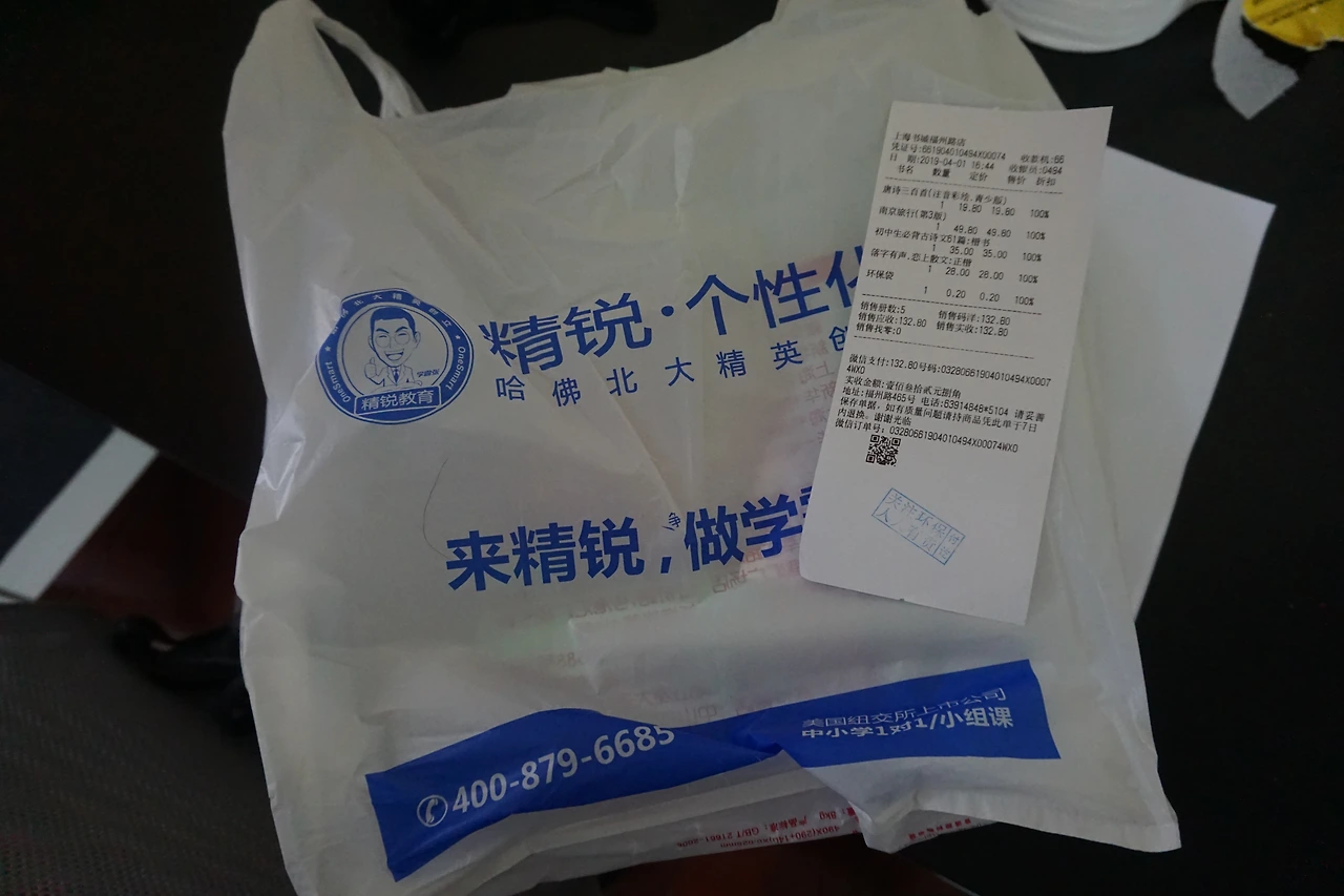 책을 세 권이나 샀는데 담아갈 가방이 없어 어쩔 수 없이 봉투를 사야 하니 1층으로 갔다. 출입문 앞 경비원 아저씨가 계신 곳에서 비닐봉지를 파는데, 재밌는 건 이 비닐이 서점 비닐이 아니다. 징루이교육(精锐教育)이라는 교육업체에서 제작한 비닐봉지인데, 서점 방문객에게 홍보도 할 겸 비닐봉지를 제공하는 모양이다. 결국 서점 자체적으로 만드는 봉투는 아예 없는 셈이다. 환경보호에 대한 관심이 느껴지면서도, 한편으론 '봉투는 내가 만든 게 아니'라는 사실을 통해 책임을 회피하려는 모습도 보인다.