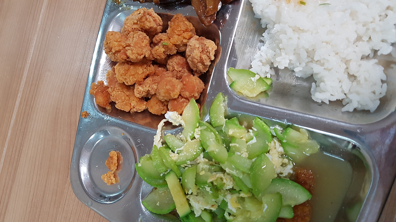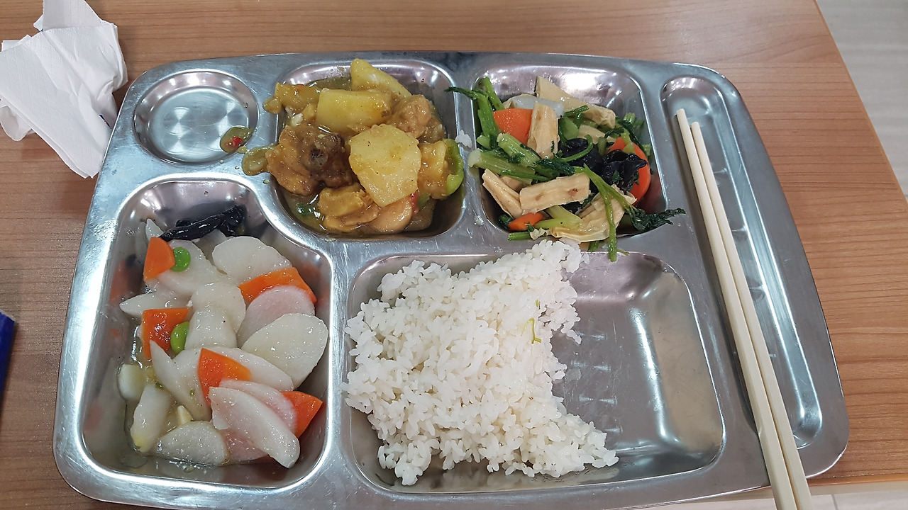 그러지 않으려고 했지만 결국 지시대명사가 잔뜩 담긴 말로 주문을 해버린다. 다 말하고 나니 눈앞에 카드 리더기에 금액이 찍힌다. 아니, 10위안도 안 하잖아? 학생카드를 꺼내 카드 체킹을 하고 왼쪽을 보니 국이 담긴 그릇이 여러 개 놓여있다. 국은 무료인 것 같다. 국 옆에 숟가락이 있었는데 모르고 그냥 식탁으로 왔더니 식탁에는 젓가락만 있다. 식당 안에 사람도 많고, 가방을 봐줄 사람도 없어서, 결국 첫날 국은 그냥 입을 대고 마셨다. 그렇게 먹은 첫날 학식이 이렇다.