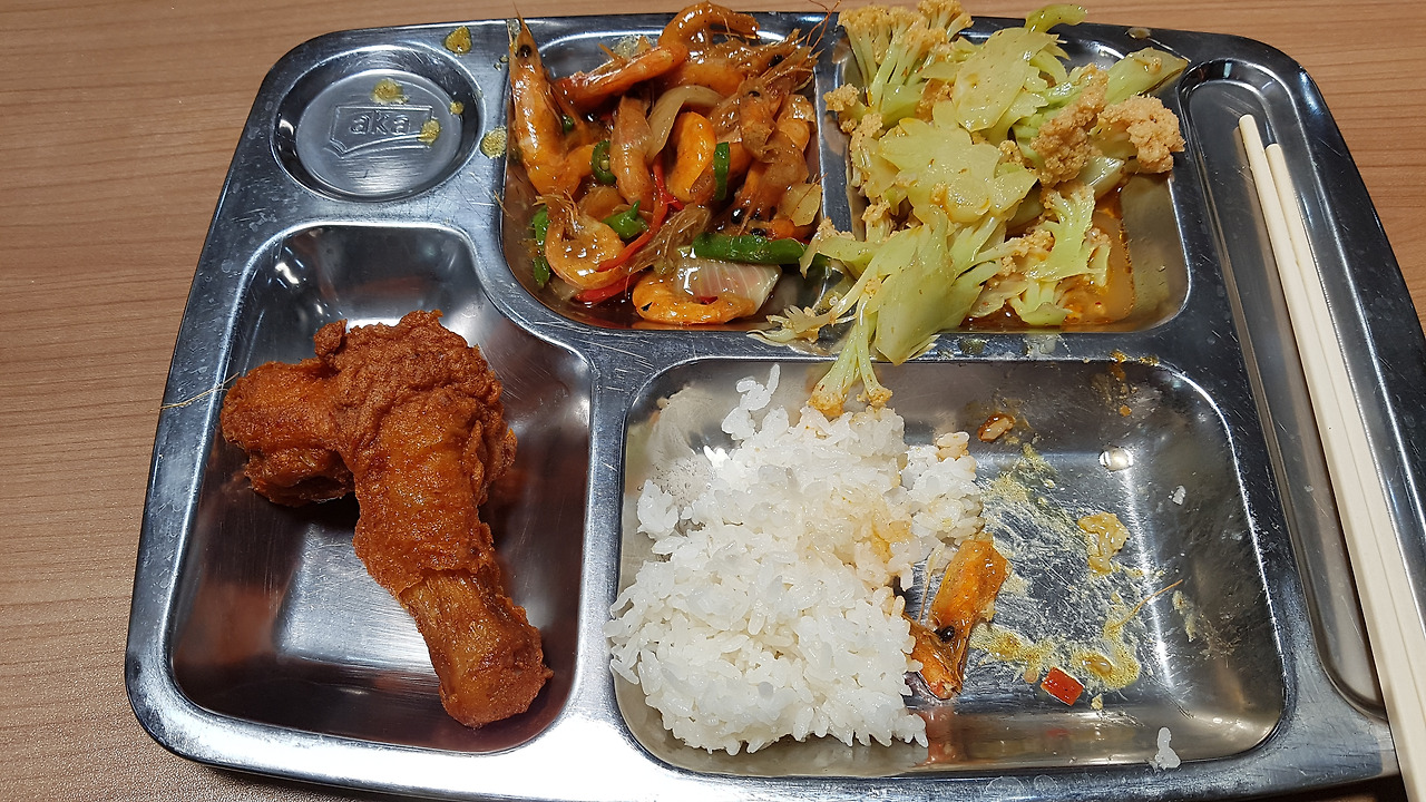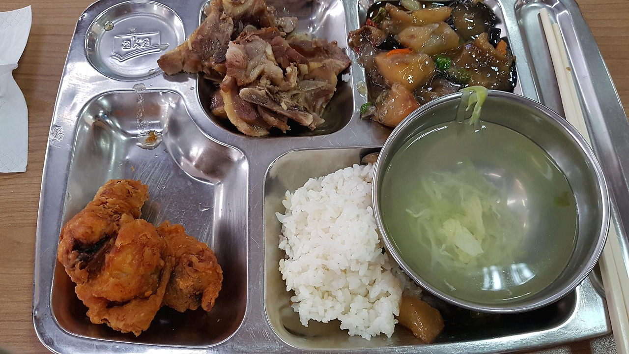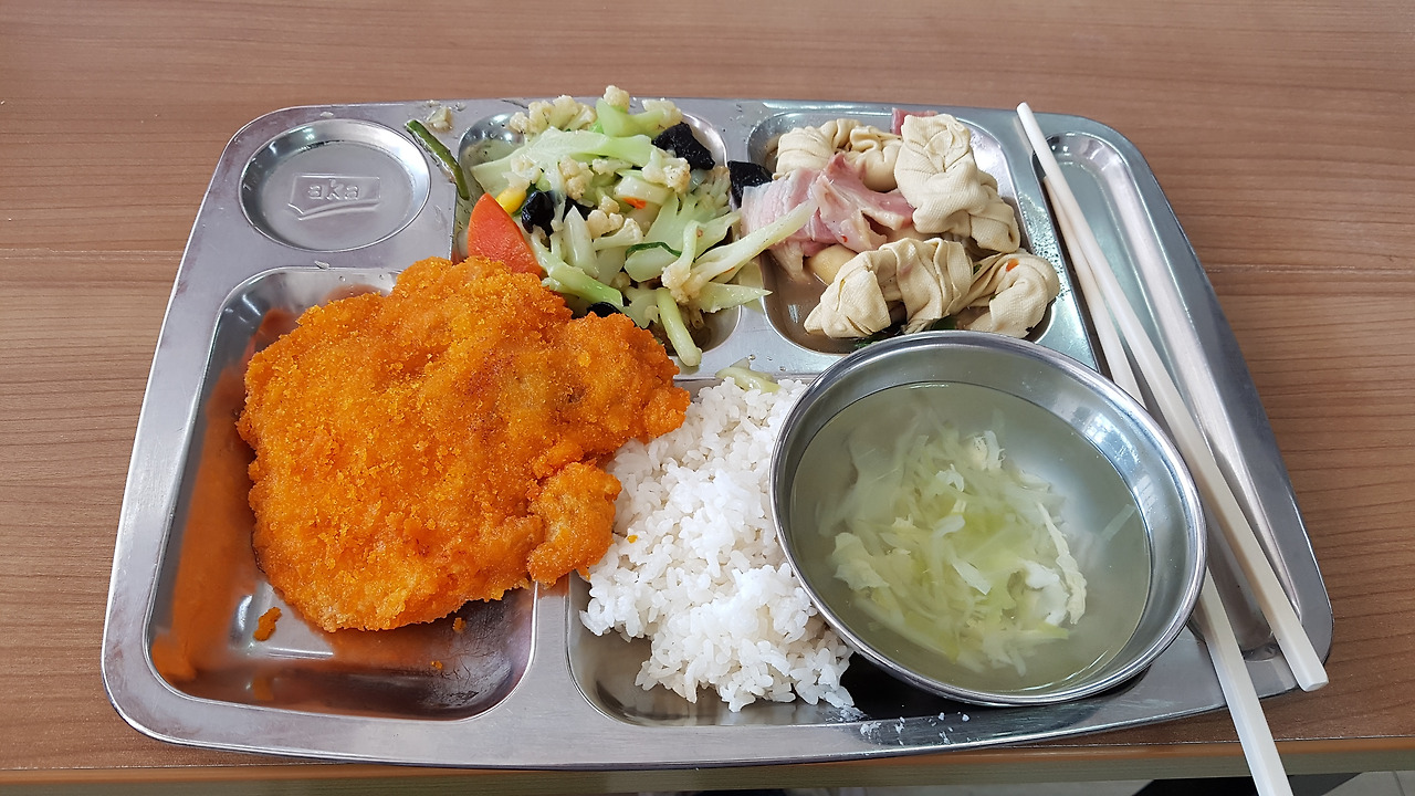 ■ 일반 학식 구역 : 앞서 첫 경험에 나를 떨게 했던 그 구역이자, 가장 흥미로운 공간이다. 사실 잘 보면 배식구 위에 여러 가지 요리 이름이 적혀있는데, 이 요리가 실제 그 배식구에서 배식해주는 요리는 아니다. 그럼 뭘 주는 줄 알고 배식을 받느냐! 이 학생들도 모른다! 학생들의 행동을 잘 살펴보면, 일단 최대한 줄이 짧은 곳에 가서 선다. 줄을 서 있는 동안 다른 학생들이 받아가는 메뉴를 스캔한다. 그리고 자기 차례가 되면 본인이 서있던 배식구에 있는 반찬을 보고 주문을 하되, 원하는 반찬이 다른 줄에 있을 경우 배식구 직원에게 저쪽 줄에 있는 무슨 음식을 가져다 달라고 말한다. 직원은 귀찮아하기는 하지만 최대한 가져다준다. (직원이 친절하지 않으면 상당히 난처한 상황이 올 수 있기 때문에, 보통은 자기 줄이나 옆줄 정도에 있는 음식 안에서 주문을 끝내는 경우가 많다.) 비용은 밥의 분량, 반찬의 개수로 책정되는 것 같다. 앞서 말한 것처럼 국은 공짜인데, 숟가락이 식탁에 놓여 있지 않으므로 필요하면 꼭 국 코너에서 가져가야 한다. 한 가지 좀 걸리는 것은, 배식구 직원의 국자는 인당 하나. 밥도, 반찬도 한 국자로 퍼주다 보니 여러 반찬을 왔다 갔다 할 땐 좀 비위생적이다. 가끔 밥에 내가 주문하지 않은 반찬의 건더기가 묻어있는 웃지 못할 해프닝도 벌어진다.