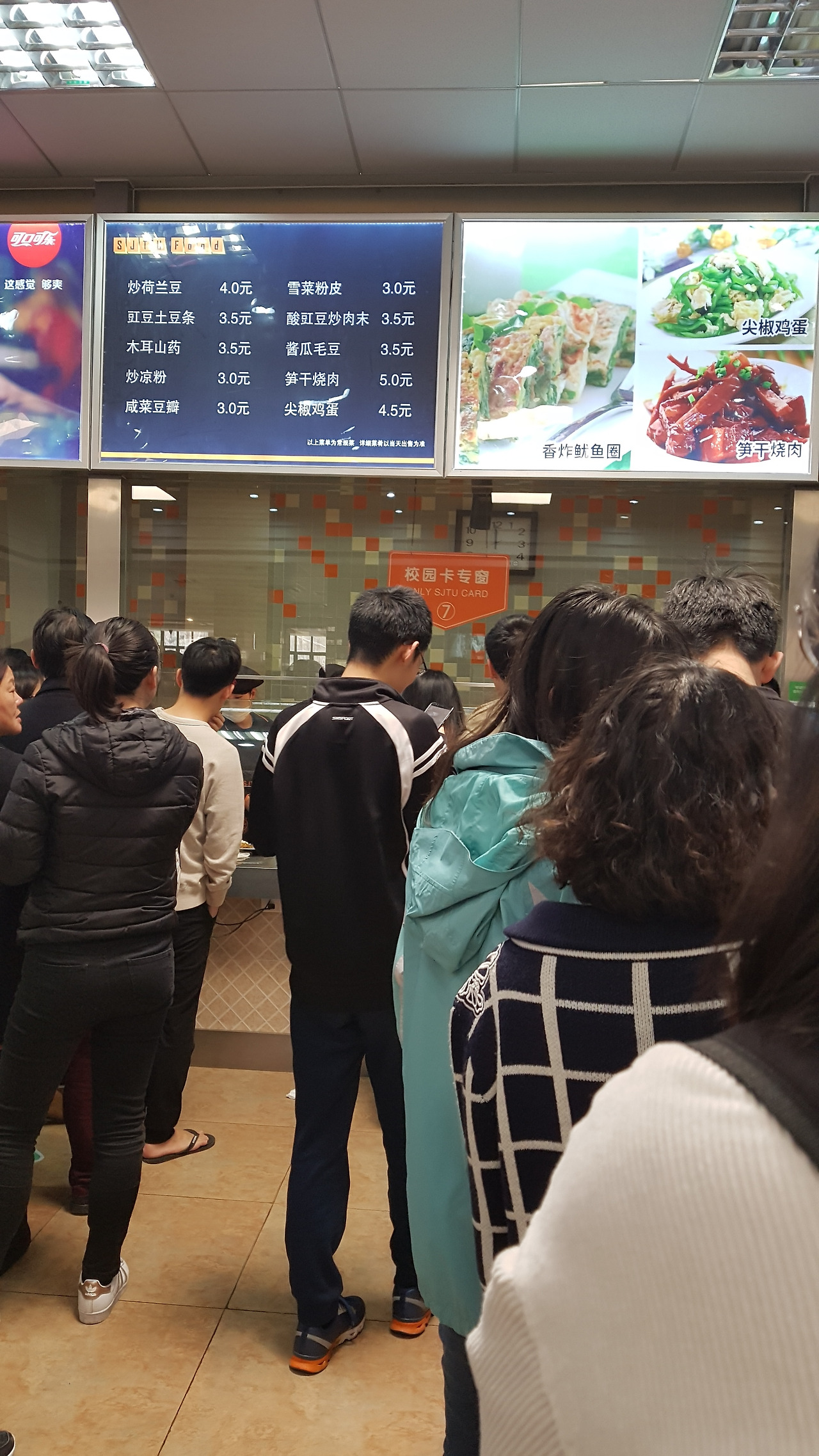 상해 물가 비싸다. 물론 재료 공수가 쉬우니 먹거리에 있어서 한국보다는 그 값이 싸다고 할 수 있지만, 중국의 다른 지역과 비교하면 확실히 비싼 편이다. 그래서 이런 대학교의 학생 식당은 점심이 되면 상해 사람들 모두의 식탁이 된다. 특히 바깥에선 식사를 할 엄두를 못 내는 할머니, 할아버지들은 학교로 오신다. 외부인에 대한 특별한 제재 조치가 있는지는 모르겠다. 하지만 캠퍼스 생활을 했던 시간 동안 특별히 교직원들이 이에 대해 제재하는 모습은 보지 못했다.