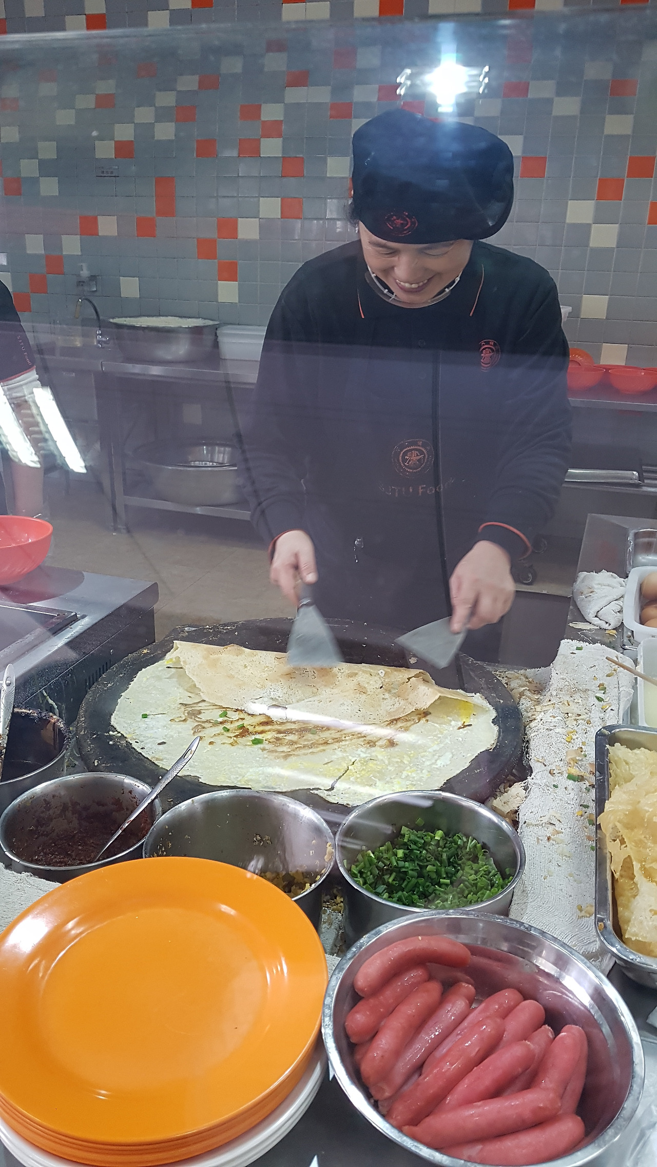 ■ 주식(主食) 구역 : 중국에서 주식이라 하면 밥, 면, 만두 등 탄수화물을 주재료로 한 메뉴를 말한다. 주식 구역은 또 여러 갈래로 나뉘는데, 훈툰(馄饨, 만둣국) 구역, 전병(饼) 구역, 찐빵 구역, 만두 구역, 볶음면 구역, 볶음밥 구역 등 다양하다. 훈툰/볶음면/볶음밥 구역은 점심에도 손님이 좀 있는 편이지만, 찐빵이나 만두, 전병 등은 아침 시간에 인기가 좋다. 훈툰은 고기만두/야채만두/새우만두 중에 고를 수가 있는데, 추가로 주문하지 않아도 만둣국 밑에 계란후라이가 들어있다. 무척 든든하다.