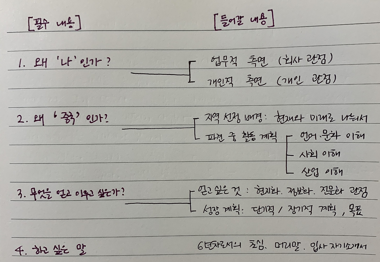 대망의 면접날이 다가왔다. 팀장/그룹장으로 구성된 면접관들 앞에서 파견 나가고 싶은 나의 마음을 최대한 진실하게 표현해야 했다. 우선 준비한 PPT를 바탕으로 지원 동기 및 파견 후 계획 등을 어필했다. 특히 마지막 페이지에는 입사 자기소개서에 있던 문구 한 단락을 인용하여 지역전문가 과정을 입사 지원할 무렵부터 꿈꿔왔음을 설명했다. 지원자 중 입사지원서를 가지고 이야기한 사람은 없었던 모양인지 이 부분에서 면접관 분들의 눈이 빛났던 것 같다.
