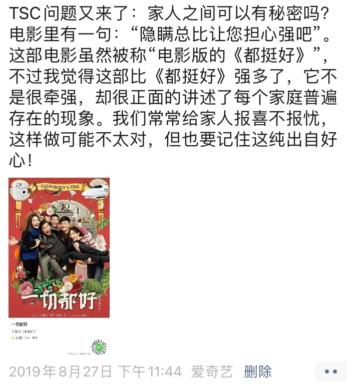 [譯] TSC 문제: 가족 간에는 비밀이 있어도 된다고 생각하는가? 영화 속에 답이 있다. "걱정시키느니 숨기는 게 낫지 않나요?" 이 영화는 비록 <도정호(都挺好)>의 영화판이라고 불리지만, 내 생각엔 <도정호(都挺好)>보다 나은 것 같다. 억지스럽지도 않고, 또 모든 가정에 보편적으로 존재하는 현상을 긍정적으로 서술했기 때문이다. 우리는 가족에게 보통 좋은 일만 말하지 나쁜 일은 잘 말하지 않는데, 이렇게 하는 게 꼭 좋다고는 할 수 없지만, 이 모든 것이 좋은 뜻에서 나온 행동임을 알아주길..