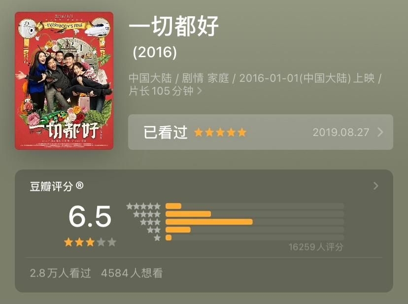 오늘 소개드릴 작품은 2016년 1월 1일 원단(元旦)에 개봉했던 허쑤이피엔(贺岁片), <일절도호(一切都好)>입니다. 제목을 직역하면 '다~ 괜찮습니다'라는 뜻인데, 혹시 매거진의 다른 리뷰를 좀 보셨던 분이라면 생각나는 드라마가 하나 있으실지도 모르겠습니다. <도정호(都挺好)>와 제목이 비슷합니다. 그래서인지 어떤 이는 이 영화가 <도정호(都挺好)>의 영화 버전이라고도 합니다만, 사실 뭐 제작연도로 치면 영화가 더 먼저니까 그다지 적절한 별칭은 아닌 듯합니다.
