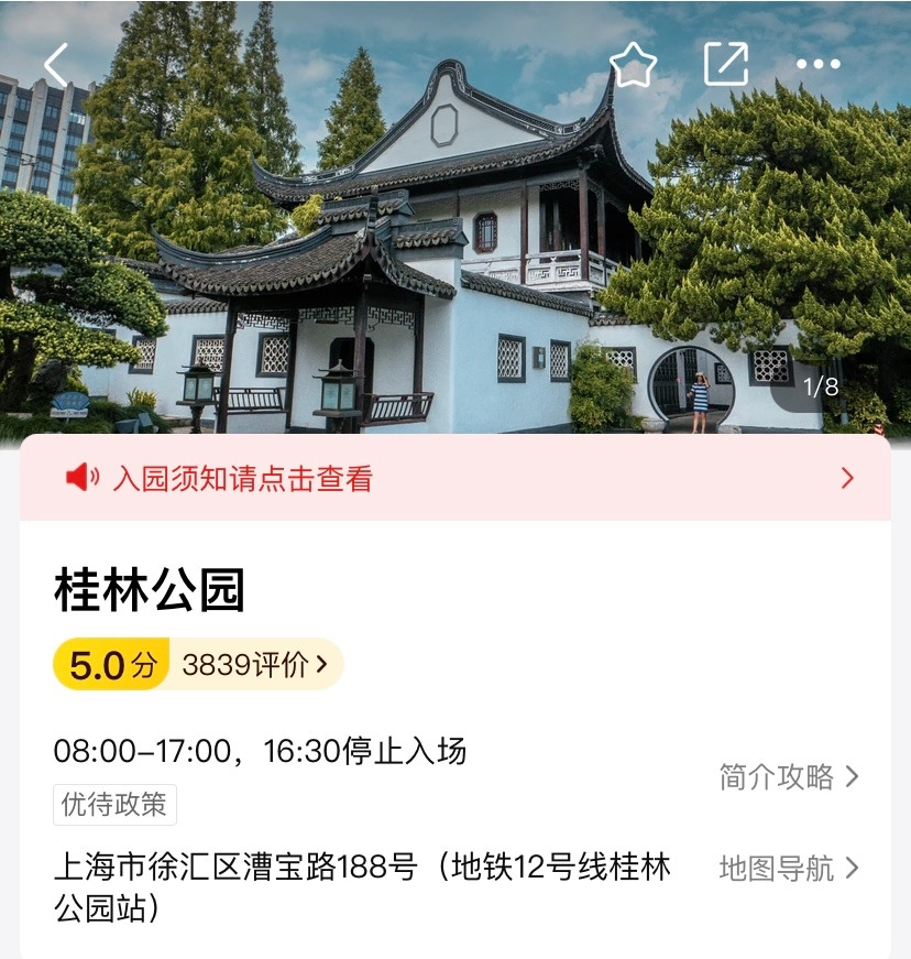 상해 계림공원(桂林公园). 상해 지하철 12호선 난징시루(南京西路) 역에서 여덟 정거장 떨어진 계림공원(桂林公园) 역에서 내리면 도착한다. 강남(江南)의 조경 양식 등을 엿볼 수 있는 예술 가치가 있는 공원이라고 알려져 있지만 사실 역사를 들여다 보면 상해의 유명한 흑사회 보스 황진롱(黄金荣, 황금영)의 사유 화원이자 별장이었다고 전해진다. 이런 이유로 계림공원은 '황가 화원(黄家花园, 황실의 화원이라는 皇家花园과 발음이 같다)'이라는 별칭도 가지고 있는데, 일제 침략을 겪은 후 전란에 손실되었던 부분을 복구하여 1988년 재개장한 모습이 지금 우리가 볼 수 있는 공원의 모습이다. 공원 내에 계수나무(桂花树)가 많아 계림공원으로 명명되었다. 가을에 오면 계수나무 꽃 축제를 볼 수 있다고 한다.