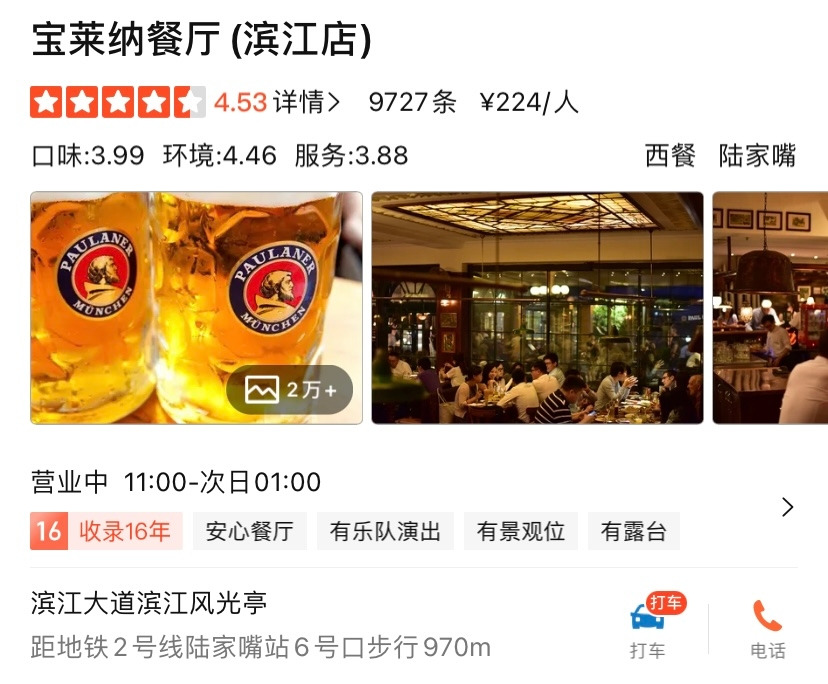 파울라너 맥주와 맥주에 곁들여 먹을 안주들을 파는 곳. 따종뎬핑(大众点评)에서 찾은 이 정보처럼, 이 식당의 아주 우월한 장점은 위치. 빈강대도 바로 앞에 위치해 있어서 야외 테라스석에 앉으면 방금 봤던 그 광경을 그냥 눈앞에서 볼 수 있다. 다만 음식값이 싸지 않다. 아무래도 위치상 너무 좋은 곳에 있다 보니 값이 비싸질 수밖에 없는 듯. 함께 밥 먹는 두 동료 중 한 명의 필살기란다. 테라스석에 앉으면 멋있는 야경을 볼 수 있고, 실내 좌석에 앉으면 저녁 8시 정도부터 라이브로 재즈를 들을 수 있다. 둘 다 나쁘지 않다.