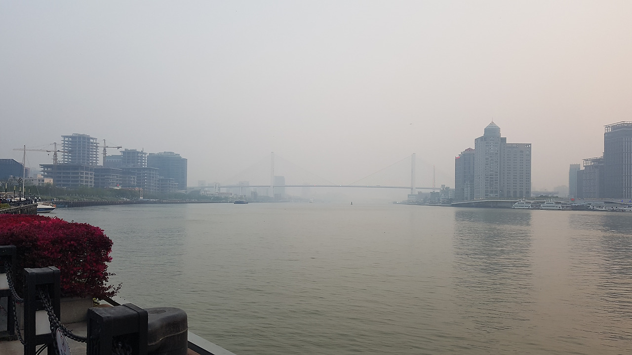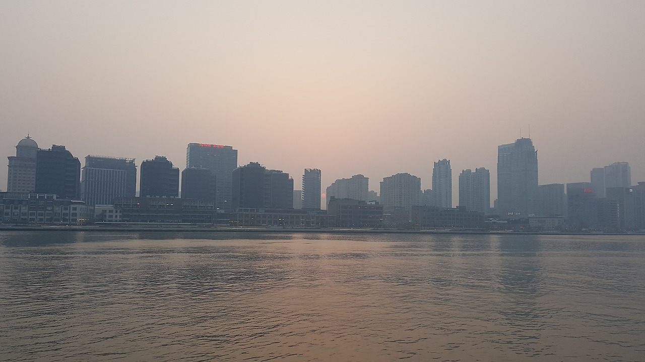 몇 분 전 사무소 근처에서 찍은 석양이라며, 좀 이따 보자고 동료들이 보내온 이 사진은 나를 더 맥 빠지게 했다. 안개가 자욱한데 경치가 뭐 제대로 보이겠냐고.... 하지만 경치 보자고 이 친구들을 부른 건 아니니 그 말은 잠시 넣어둔다. 그래도 용하게 건물 사이에 져가는 태양이 찍혔네. 이미 빈강대도의 야경에 대한 기대치는 곤두박질친 상태로 약속 장소에 다 왔을 무렵, 생각지도 못한 야경이 나를 반긴다.