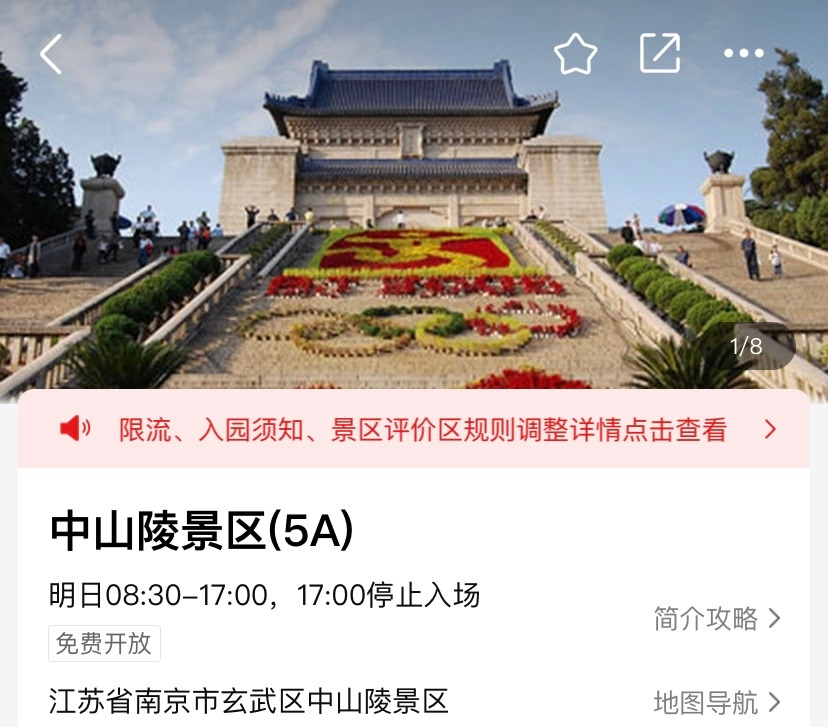 이 지역의 정식 명칭은 중산풍경명승구(钟山风景名胜区). 이곳에 위치한 산의 이름이 중산(钟山, 자금산紫金山이라고도 함)이라서 붙여진 이름이다. 중산풍경명승구로 묶여 있는 이 지역 안에는 두 묘역이 포함되어 있는데, 하나는 명나라 초대 황제 주원장의 무덤인 명효릉(明孝陵)이고, 또 하나는 중화민국의 국부 손중산(쑨원)의 묘인 중산릉(中山陵)이다. 중국 역사에서 중요한 인물의 묘역이 둘씩이나 위치해서일까? 이곳은 중국의 그 수많은 관광지 중 가장 먼저 국가 지정을 받은 관광지이자, 처음으로 5A라는 등급이 매겨진 곳이다.