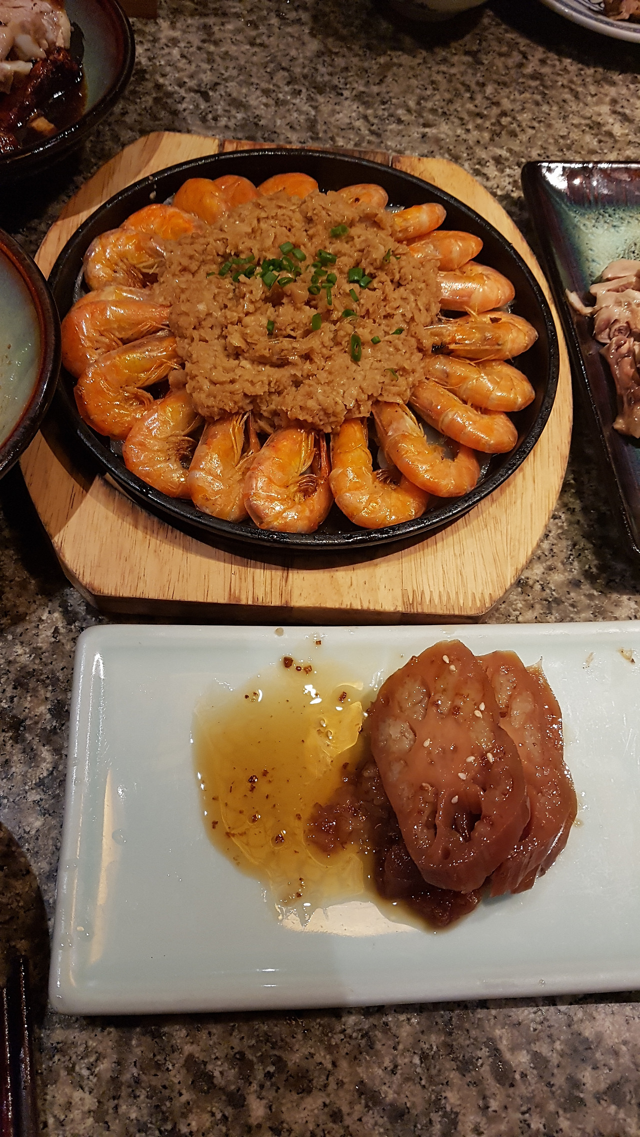 요리는 지금 생각하면 좀 균형이 안 맞는 조합인데, 우선 고기 요리로는 오리고기가 유명한 난징의 대표적인 오리 요리 옌수이야(盐水鸭)와 진링카오야(金陵烤鸭)를 시켰고, 오빠들이 궁금해한 바오빙니우러우송(薄饼牛肉松, 얇은 밀전병에 잘게 썰은 소고기 야채볶음을 싸서 먹는 요리)도 시켰다. 또 돼지곱창을 볶은 요리를 하나 시킨 것 같은데 이름은 못 찾았다. 야채 요리로는 연근 요리가 유명한 지역이니만큼 미즈오우(蜜汁藕, 연근을 꿀물에 졸인 조림)를 시켰다. 언제 어디서나 안전한 새우 마늘구이도 시켰다. 그리고 마지막 디저트류로 탕위먀오(古法糖芋苗, 시럽 농도의 단 물에 토란으로 만든 완자를 넣은 디저트)를 시켰다.
