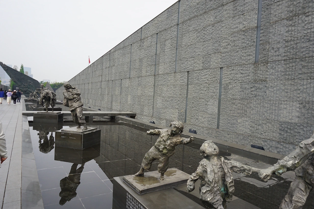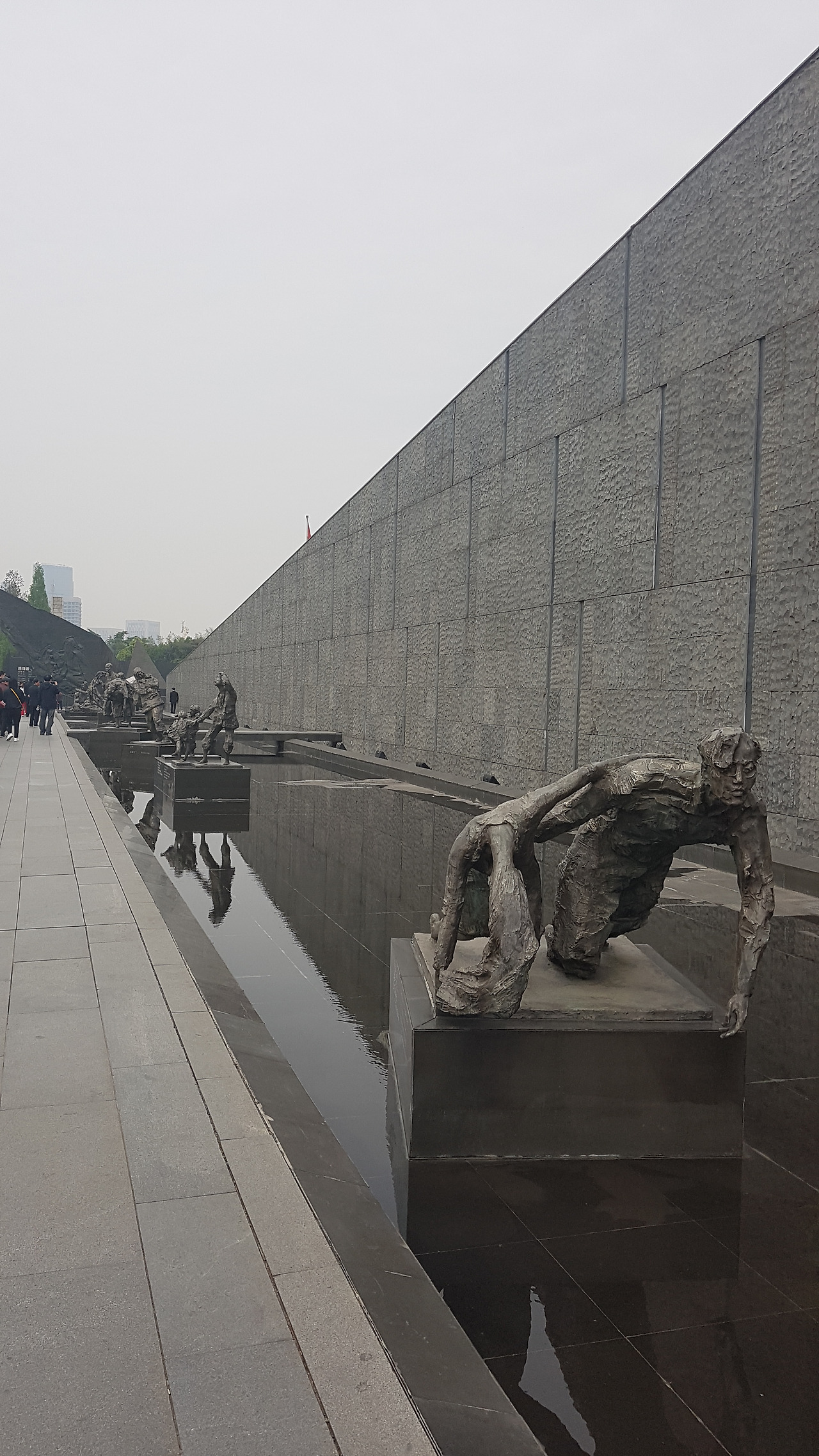 기념관 안으로 들어가기 위해 입구로 가는 길에는 이렇게 다양한 조각상들이 놓여 있다. 난징대학살의 피해를 겪은 민간인들의 모습을 예술로서 승화시킨 작품들이다. 그중 망연자실한 표정으로 하늘을 향해 서 있는 여성의 동상에 붙어있는 제목은 <가파인망(家破人亡)>. 가정이 깨지고, 사람도 죽었다는 뜻이다. 절망 가득한 표정으로 하늘을 바라보고 서 있는 그 모습에 잠시 할 말을 잃는다.
